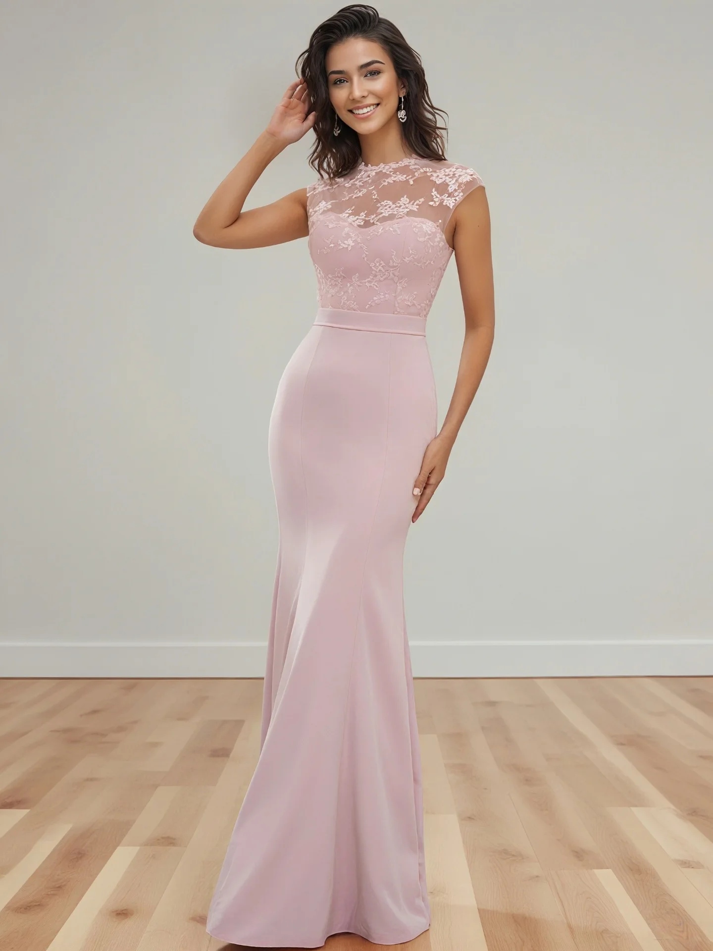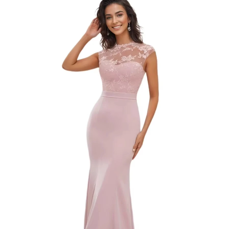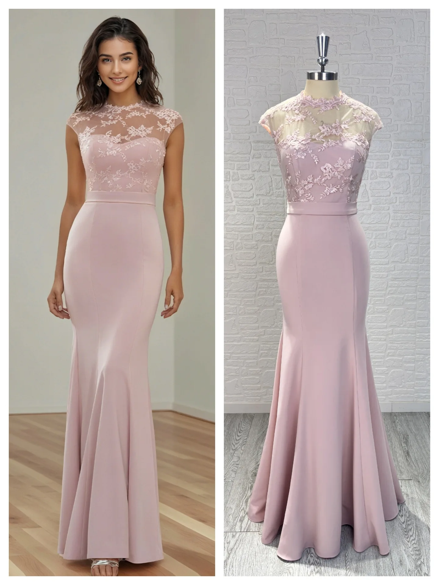 Lace Illusion Mermaid Bridesmaid Dress - Sleeveless Blush Formal Gown Evening Party Dress