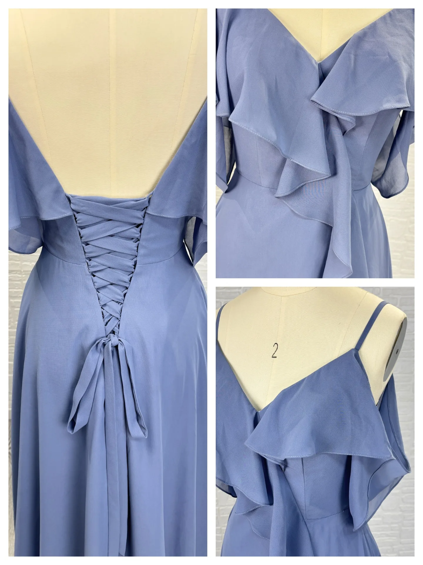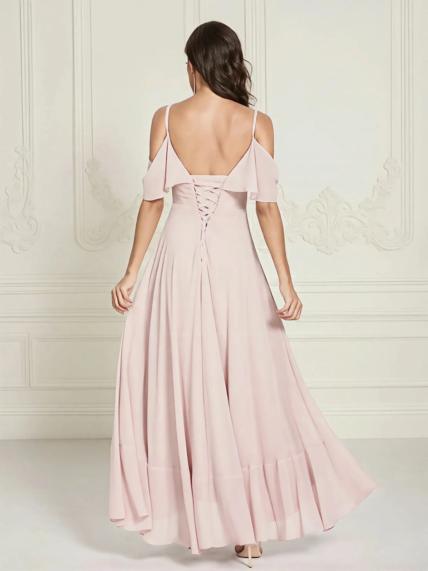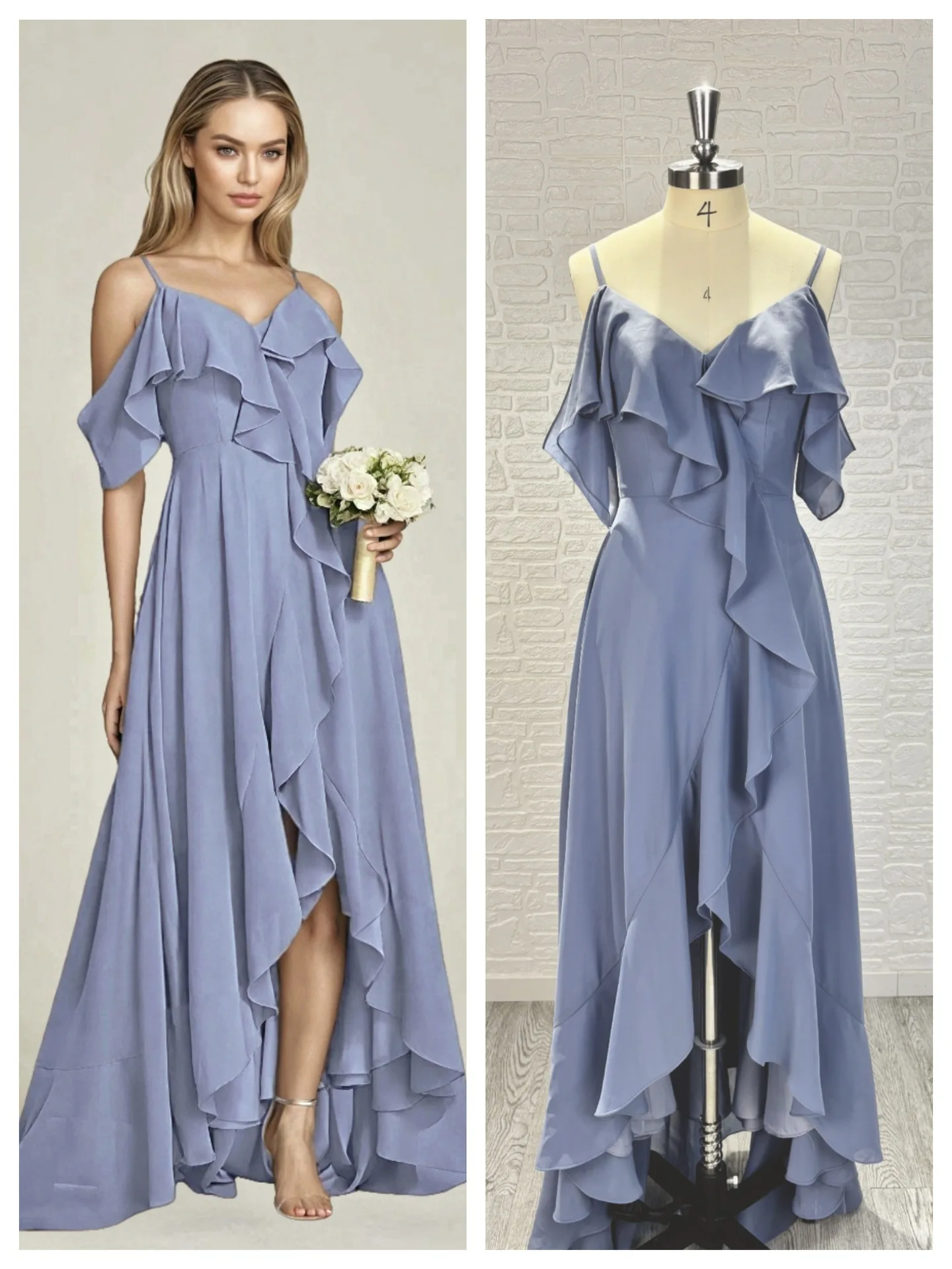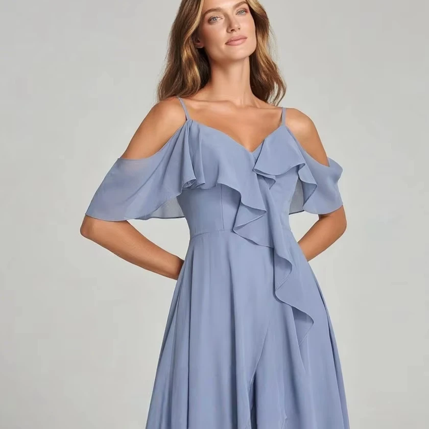 Sweet Style Asymmetric Hem Ruffled Chiffon Bridesmaid Dress Light Blue Off Shoulder Maxi Gown