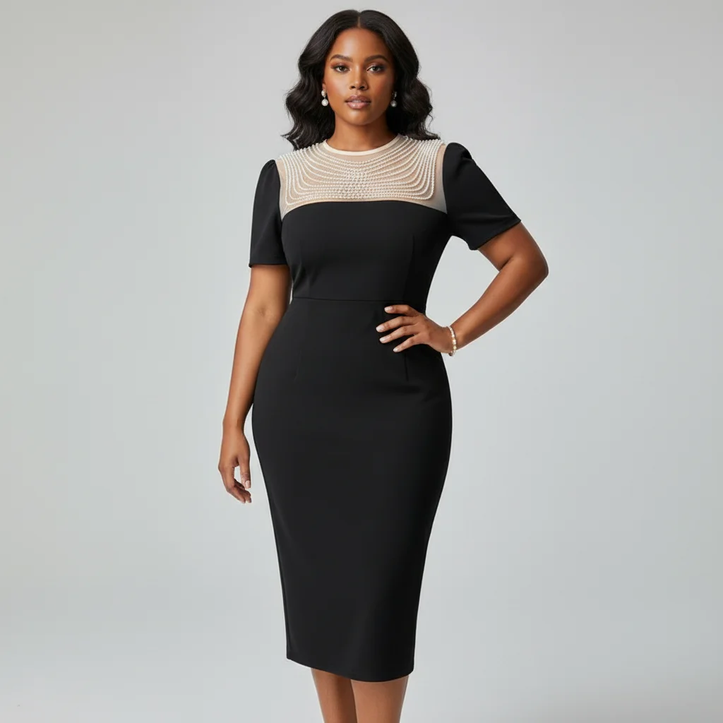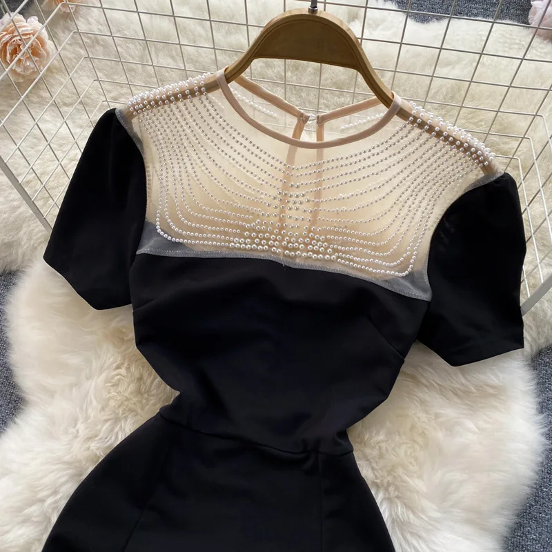 ZYHT 21938 Black Velvet Mini Dress Square Neck Long Puff Sleeves with Pearl Trim & Crystal Dess Flared Scalloped Hem Dresses