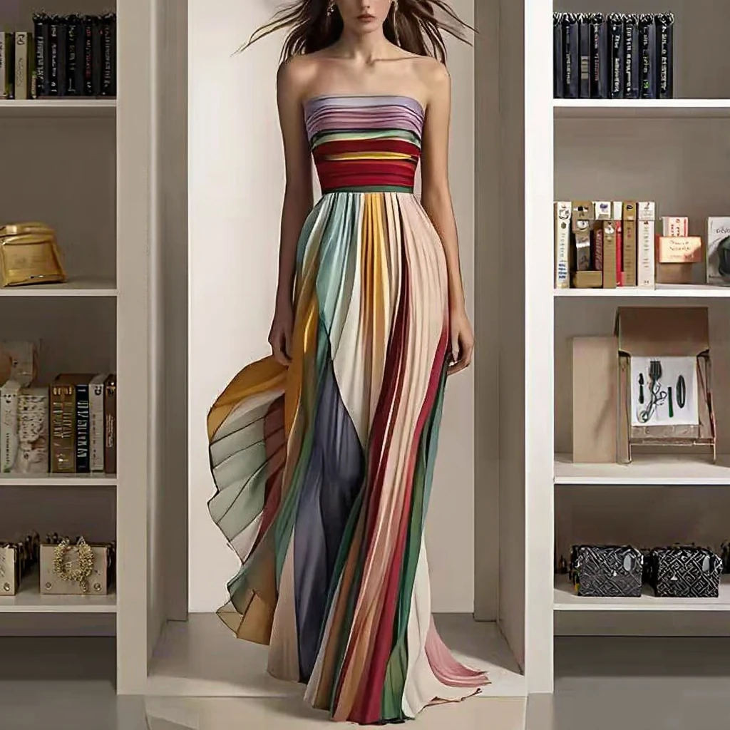 2026 European Sexy Strapless Long Dress for Women Elegant and Colorful Casual Dresses Striped Pattern
