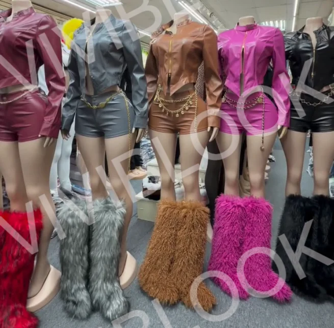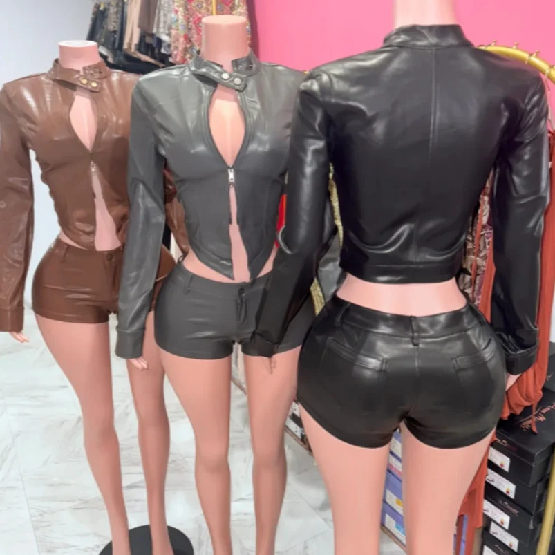 Viviblook Z107ST Women's Leather Stand Collar Zipper Jacket Long Sleeved Top Mini Shorts Moto Biker MatchingTwo-piece Set