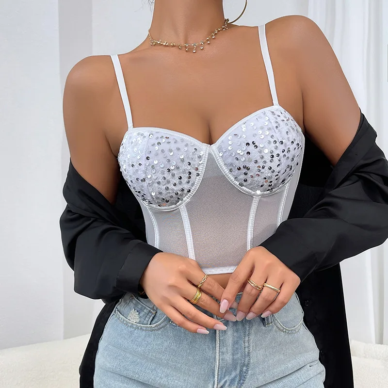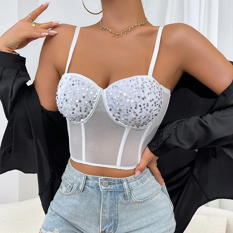 BOON Women's Sexy Corset Top Ruffled Trim Rhinestone Accents Breathable Spandex/Polyester Blend Fitted Waist Design