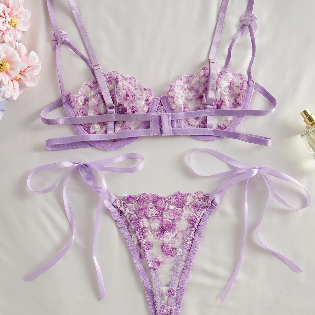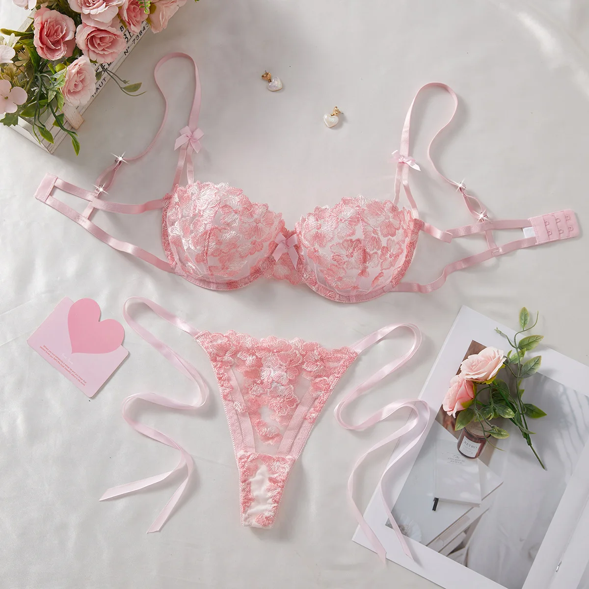 2026 Cross-Border Summer New Arrival: Snowflake Embroidered Sheer Lace Plunging Neckline Seductive Lingerie Set