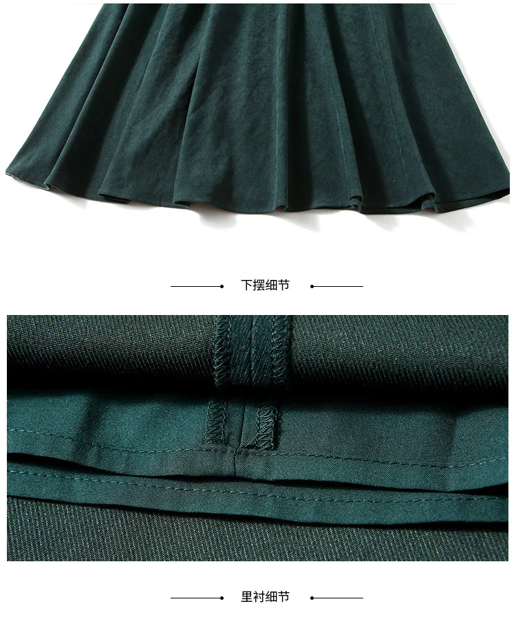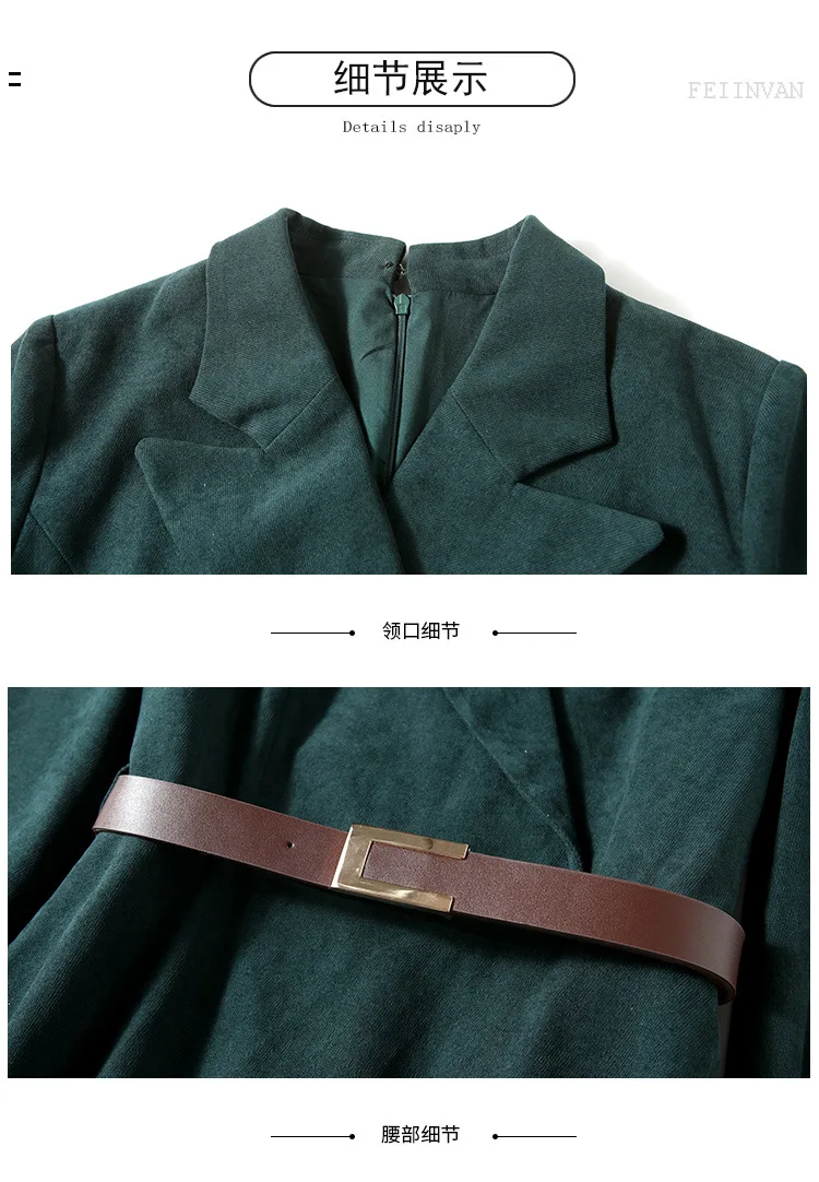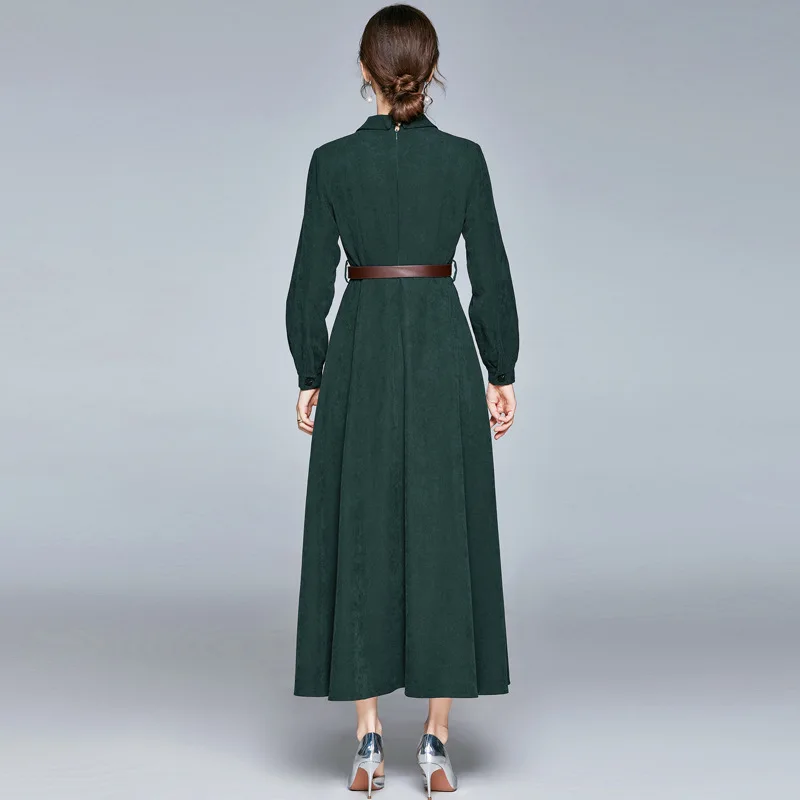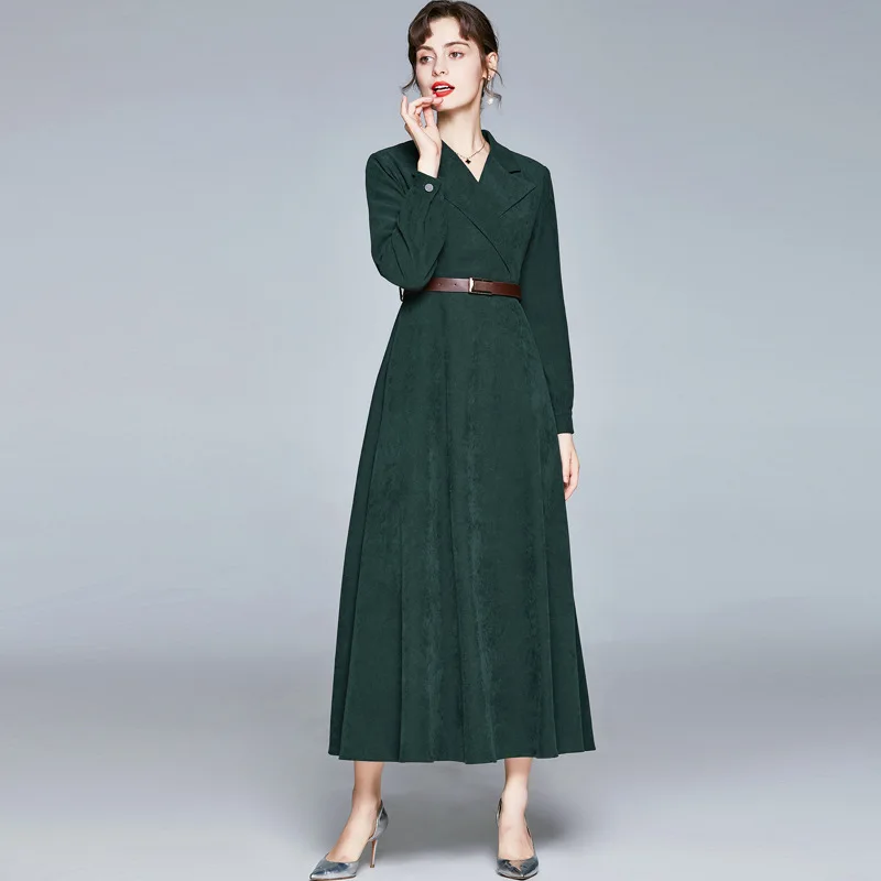 2023 Autumn and Winter Blazer Collar Corduroy V Neck Belt Waist Big Swing Dark Green Long Dress for Woman