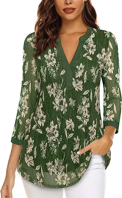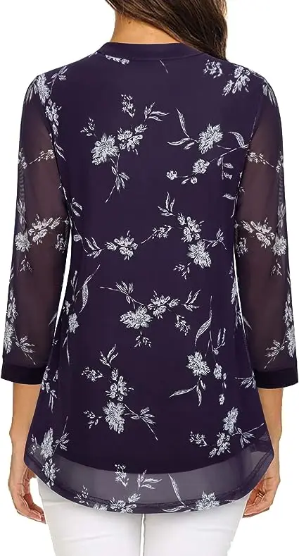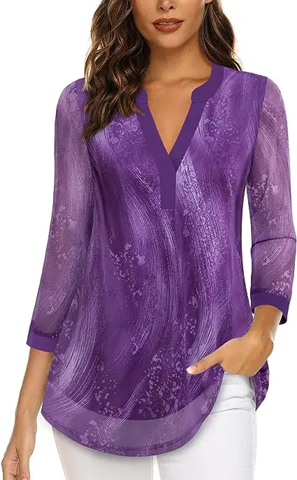 Women's 3/4 Sleeve Blouses Casual V Neck Dress Shirts Double Layers Mesh Tunics Tops Asymmetric Tunic