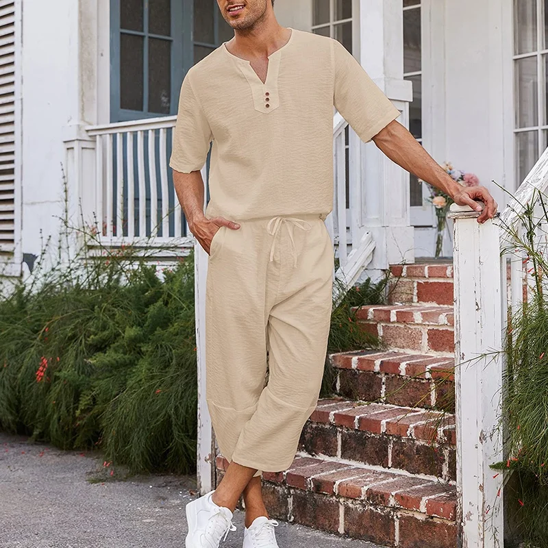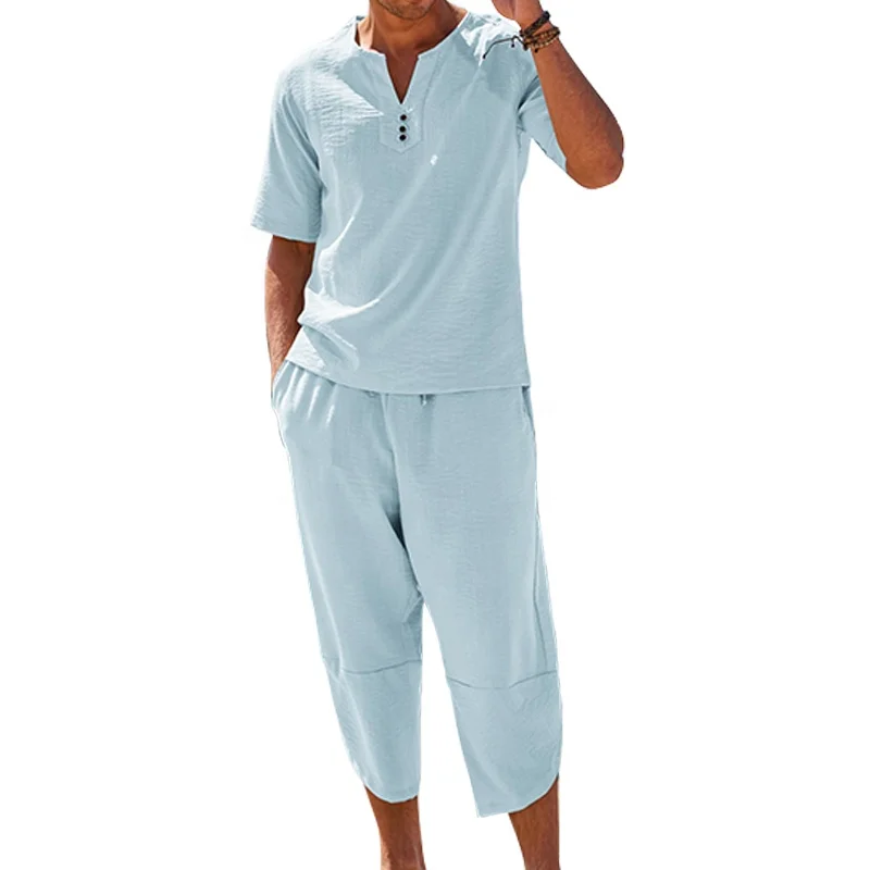 Custom Solid Color O-Neck Spandex/Cotton Quick Dry Breathable Short Sleeve Two-Piece Beach Casual Summer Suit for Men