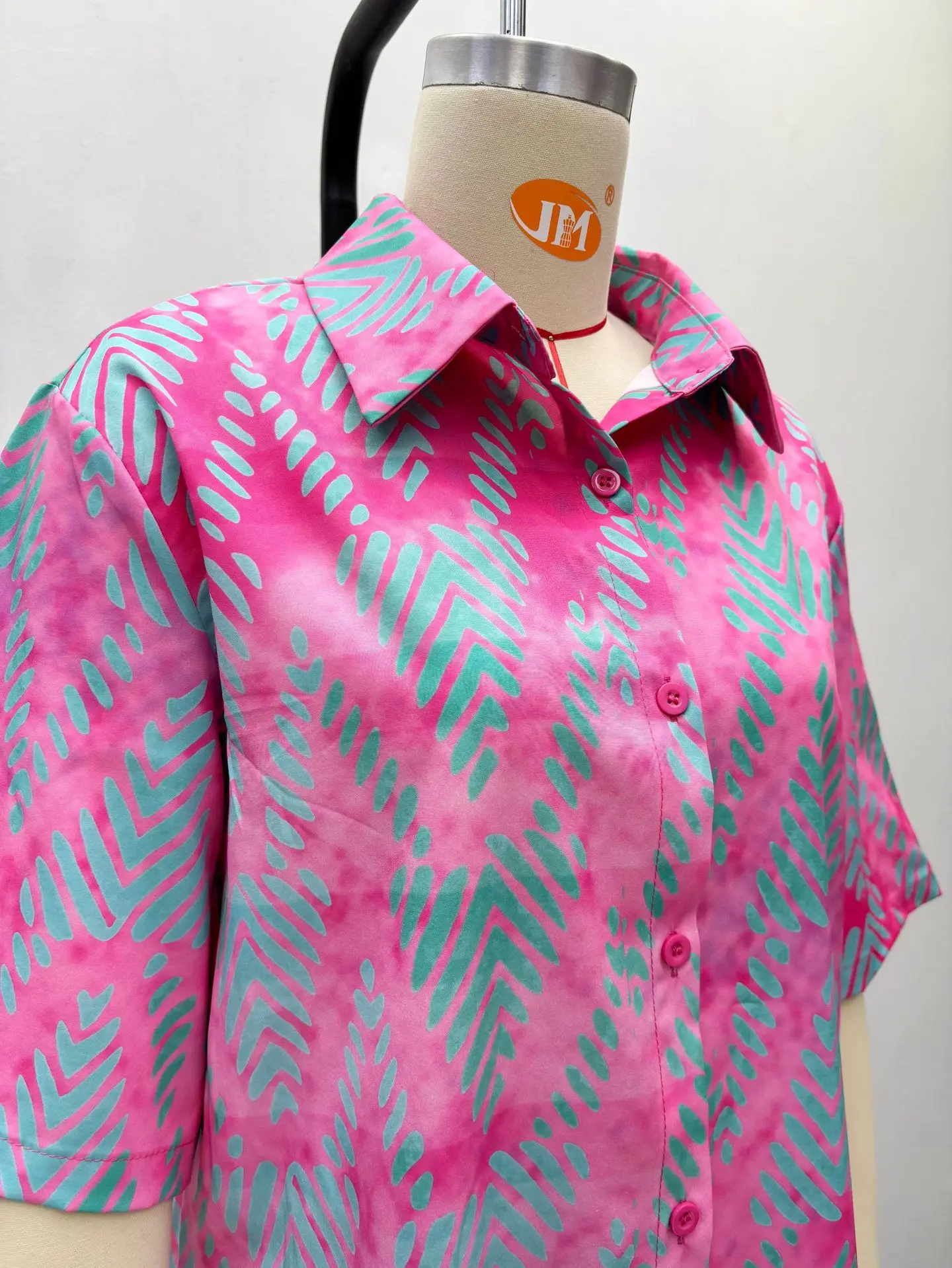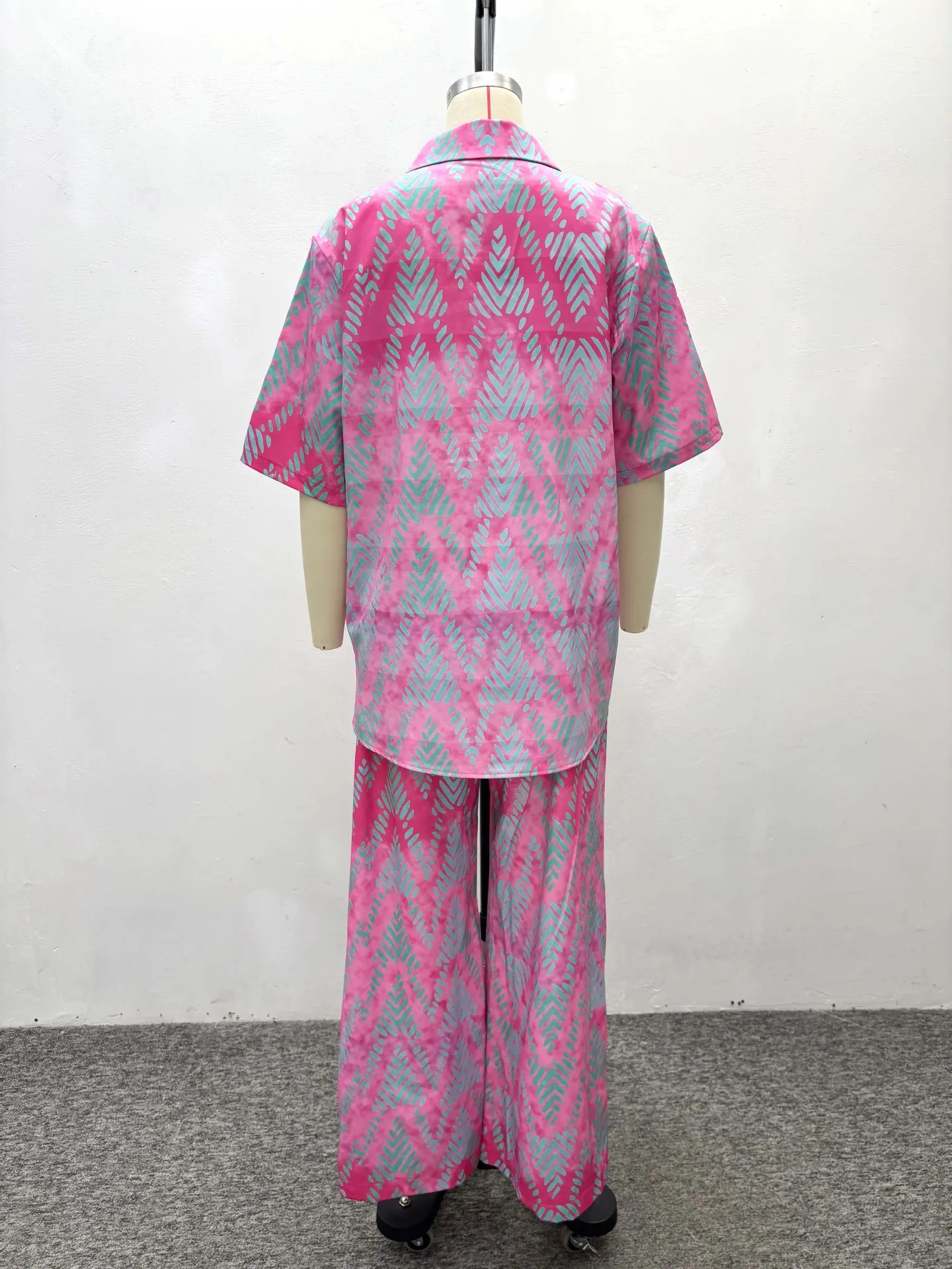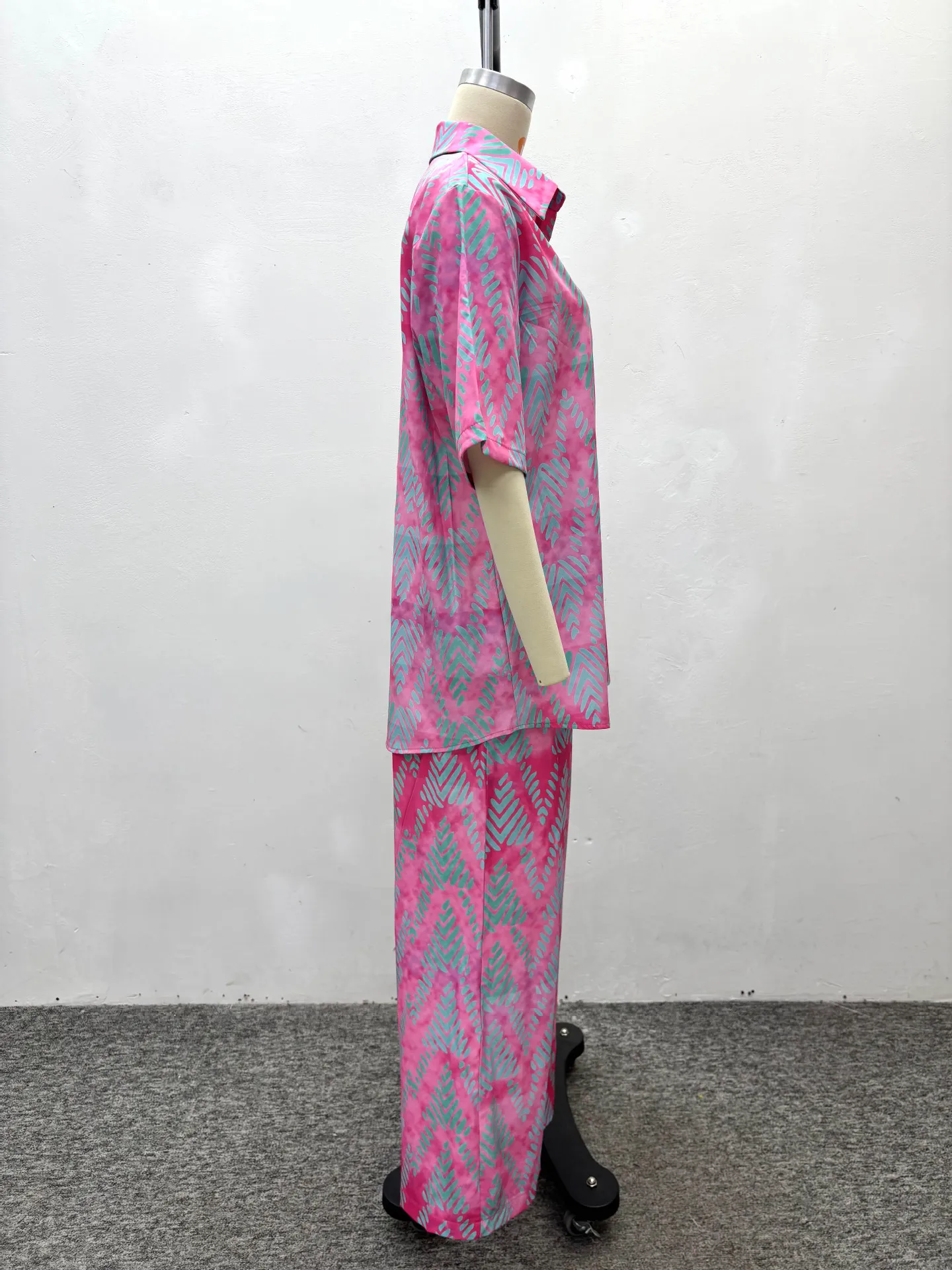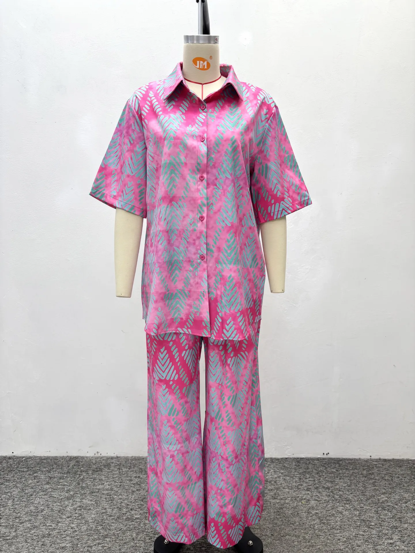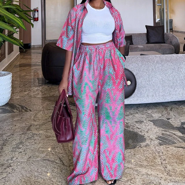 GX7349 Fashion Fall 2026 Women Clothing Boutique Casual Street Wear Short Sleeve Printed Shirt and Wide Leg Pant 2 Piece Set