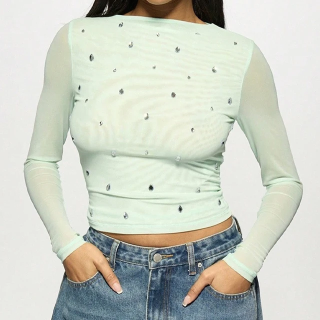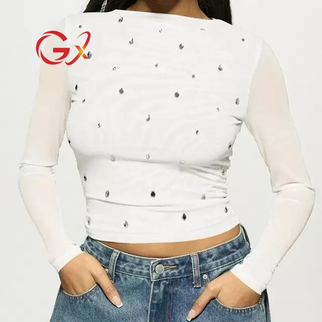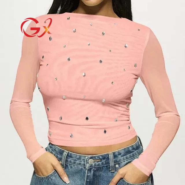 GX2569 Fashion 2026 Spring Fall Blouse O-Neck Mesh Tops Long Sleeve Rhinestone T-shirt Women