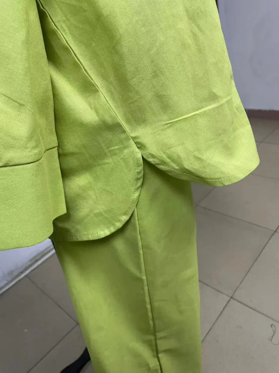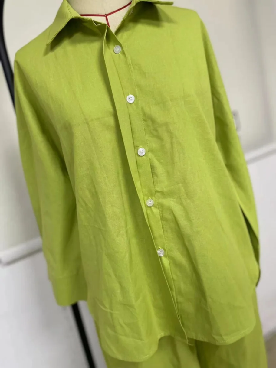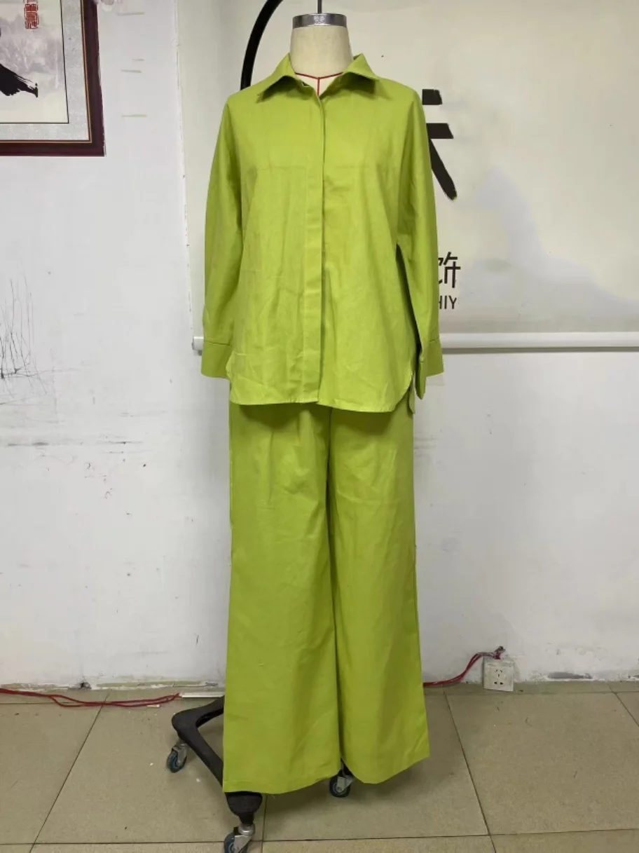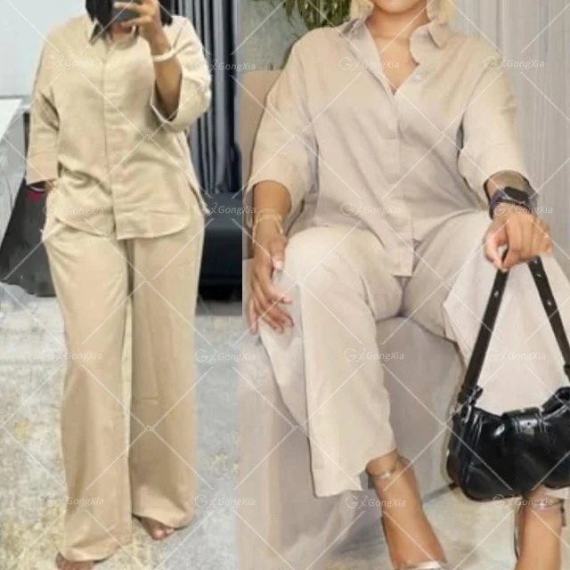 GX18120 Fashion Spring Autumn Lady Plus Size Street Wear Women Linen Outfit Long Sleeve Shirt and Wide Leg Pant 2 Piece Set