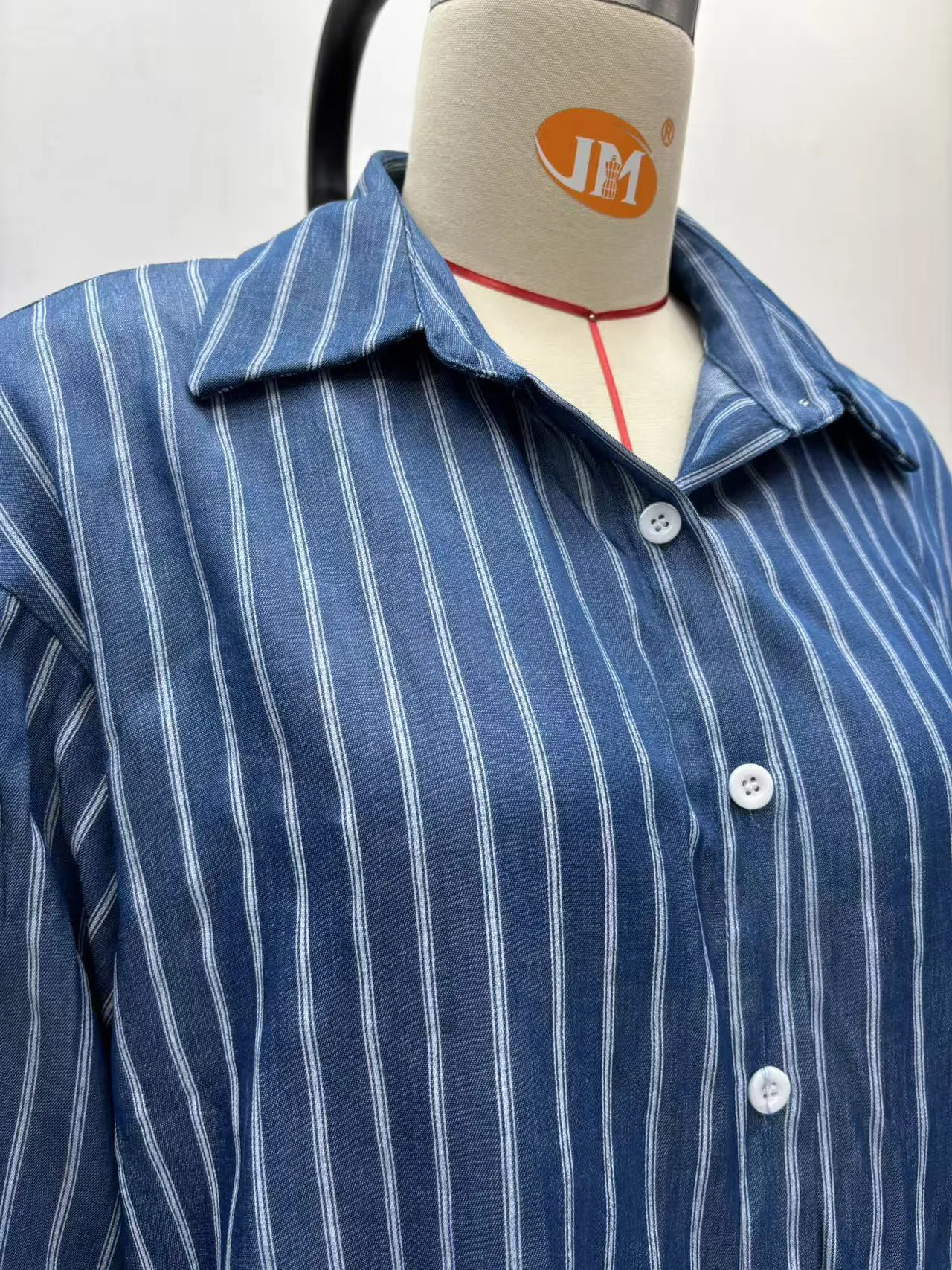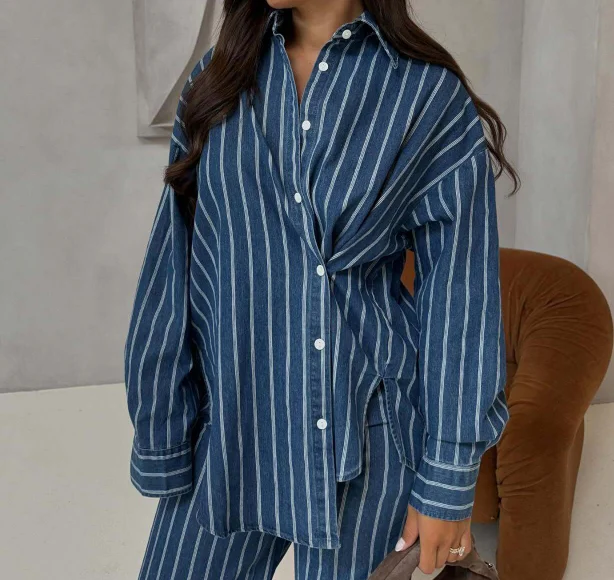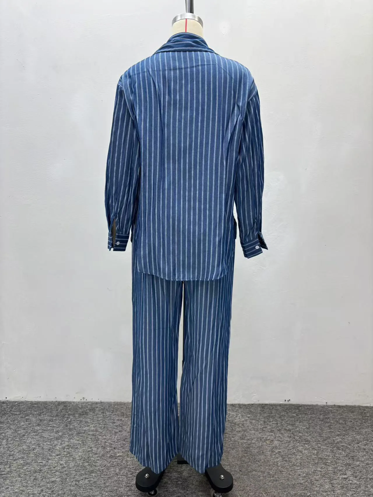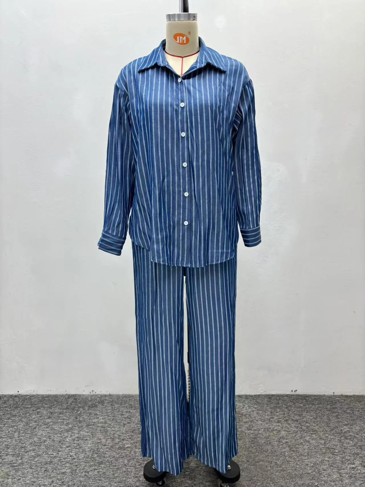GX7335 Fashion 2026 Fall Street Wear Lady Clothing Boutique Long Sleeve Stripped Shirt and Wide Leg Pant Women 2 Piece Sets