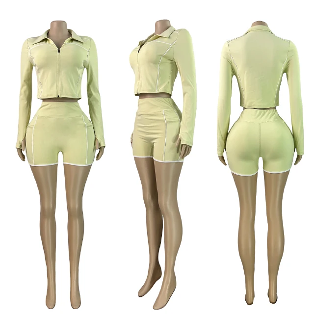 GX25103 Fashion Women Clothing Boutique Street Active Wear Long Sleeve Zipper Jacket Top and Jogger Shorts 2 Piece Set