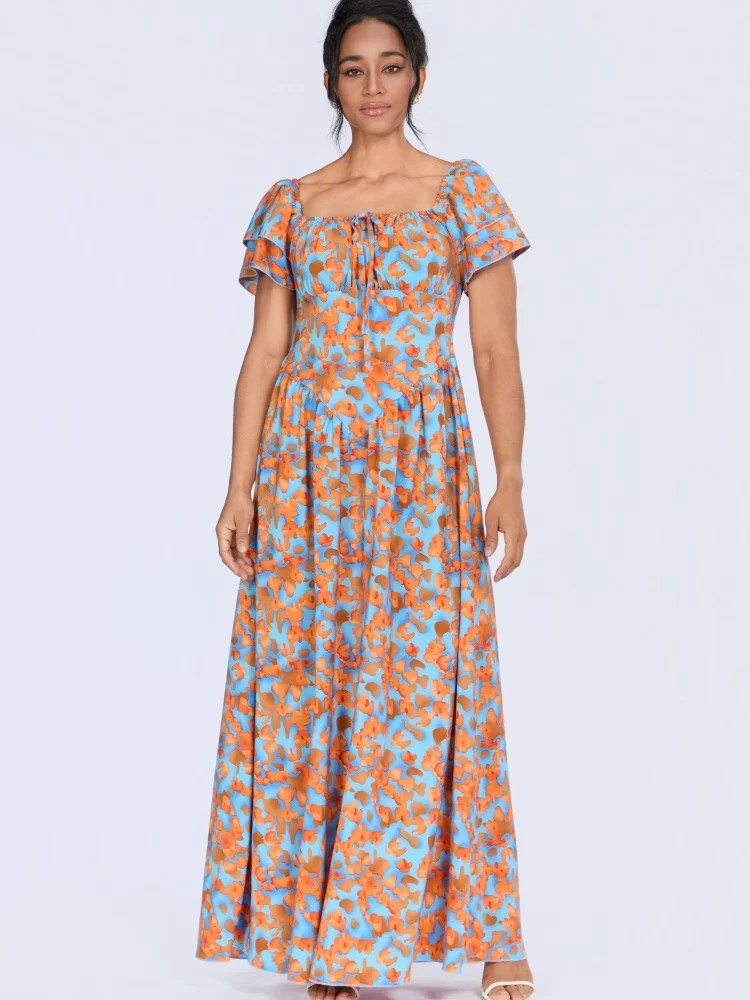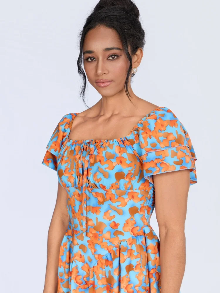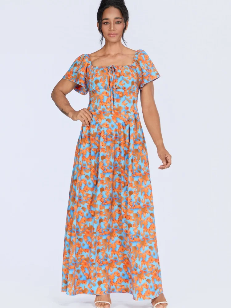 New Wholesale Summer Fashion Printing Casual Ruffled Short Sleeve square Collar A- Line Dress