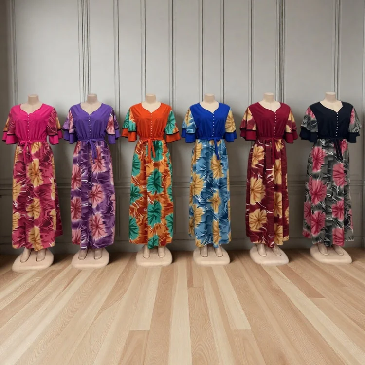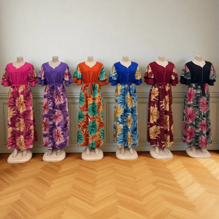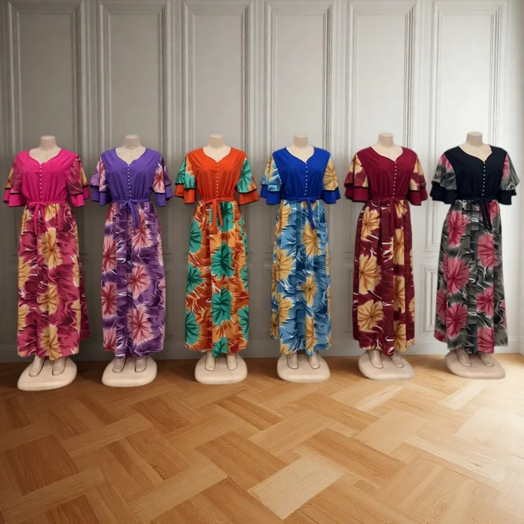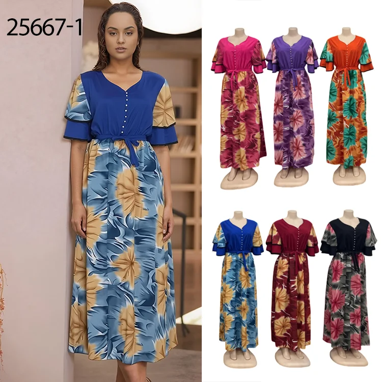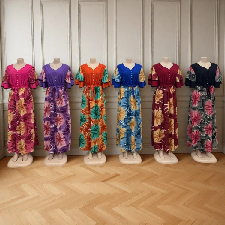 Wholesale New Women's Casual Printed Double-Layer Ruffled Short Sleeve V-Neck Dress