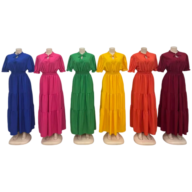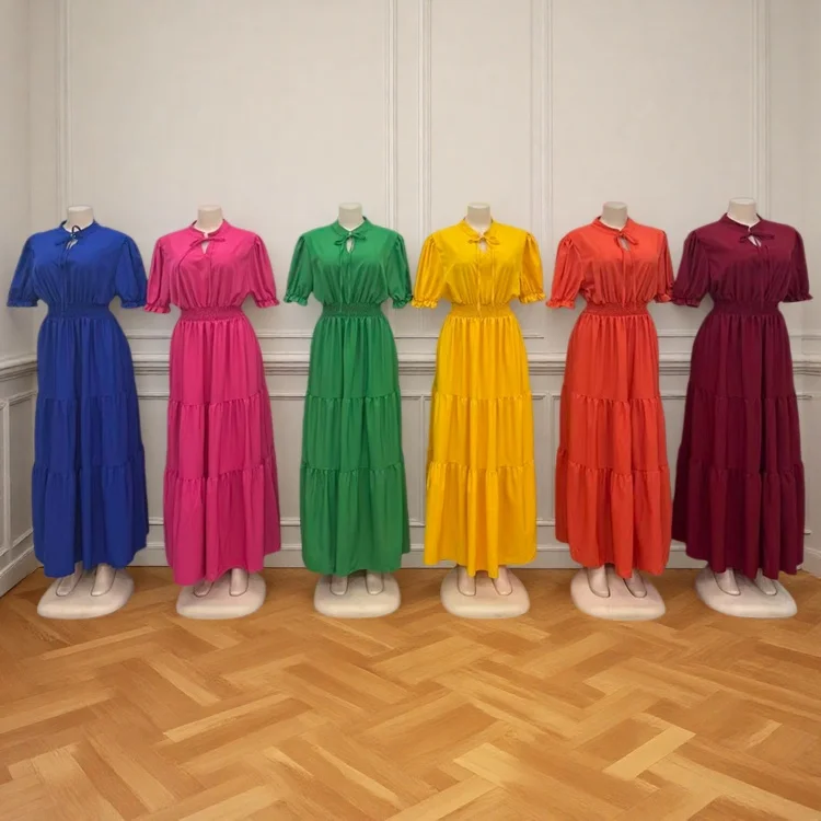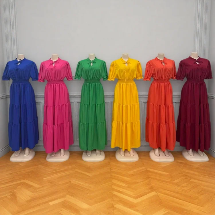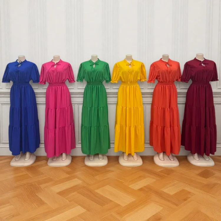 Summer New Round Neck Short Sleeve Wrinkle Bow High Waist Solid Color Women's Dress