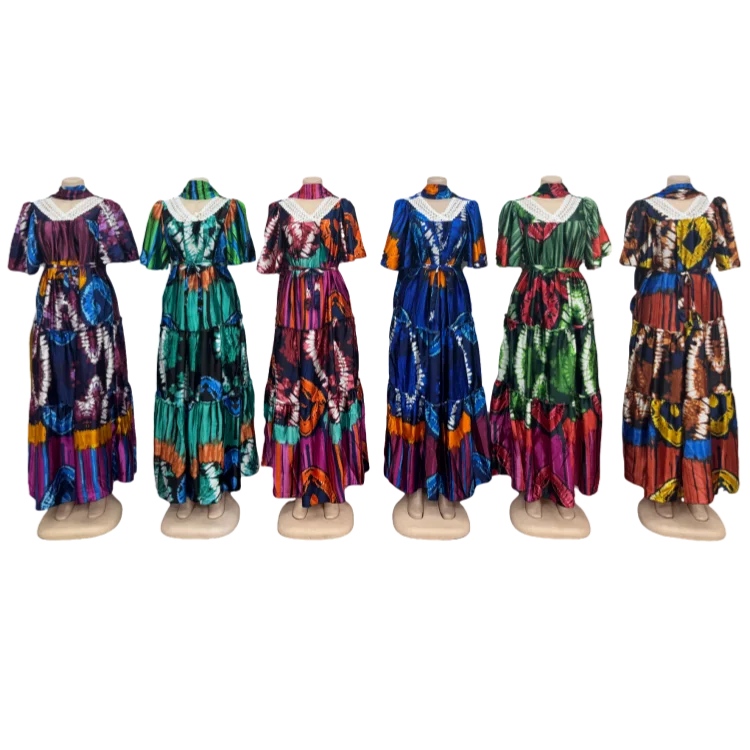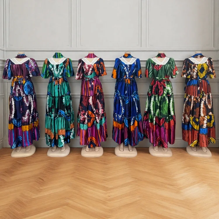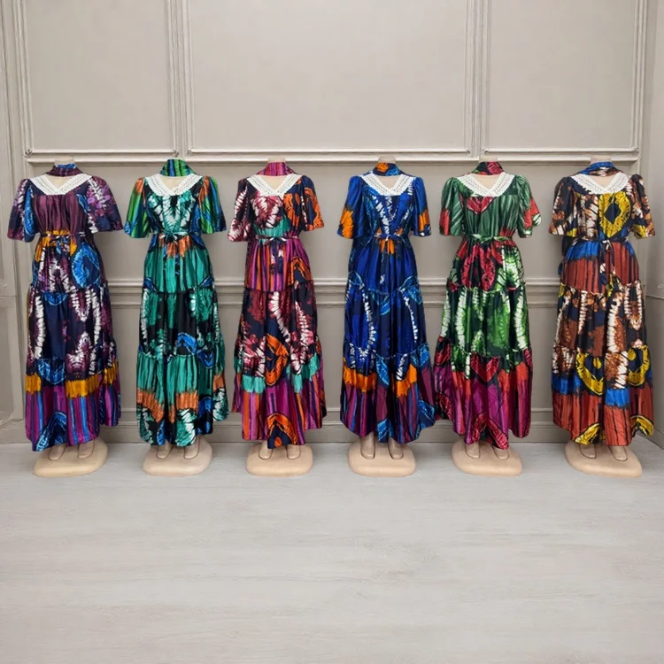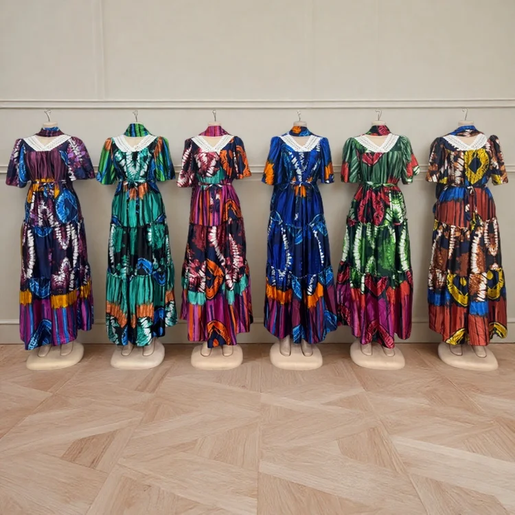 Wholesale Spring Lace V-neck Casual Women Muslim Print Short Sleeve Dress