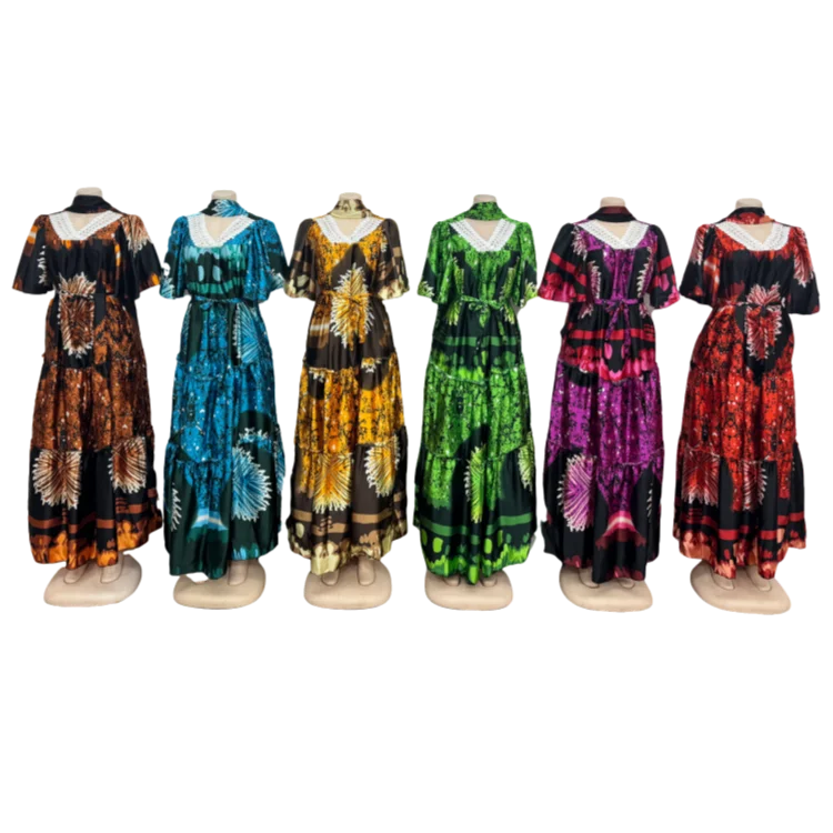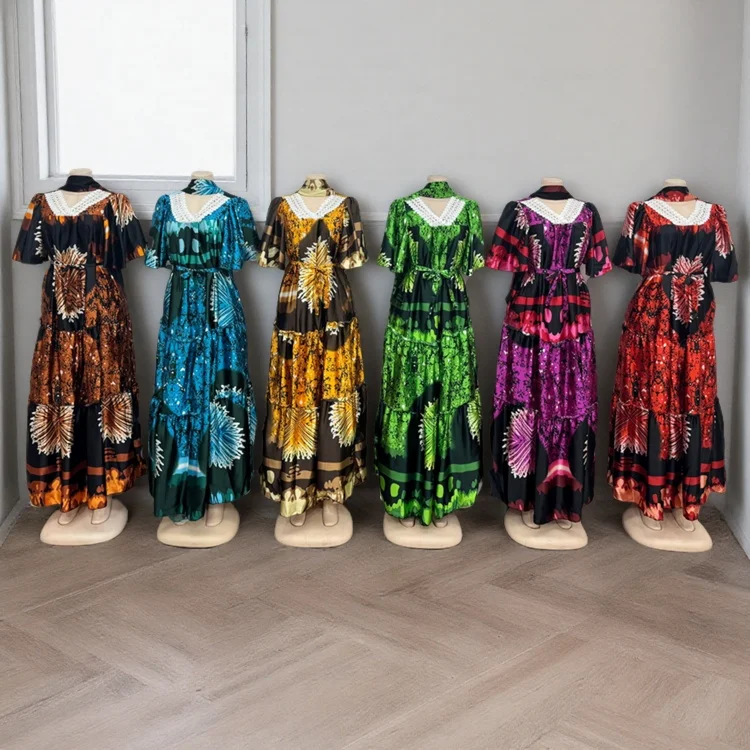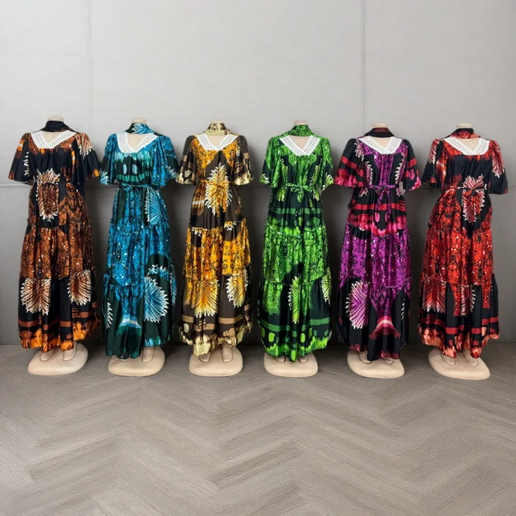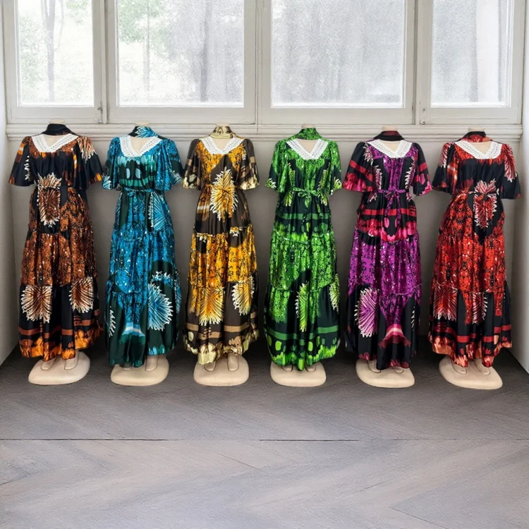 Wholesale New Fashion Ladies Lace V-neck Casual Printed Belt Short Sleeve Dress