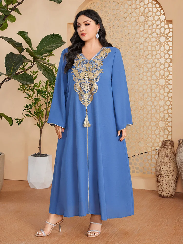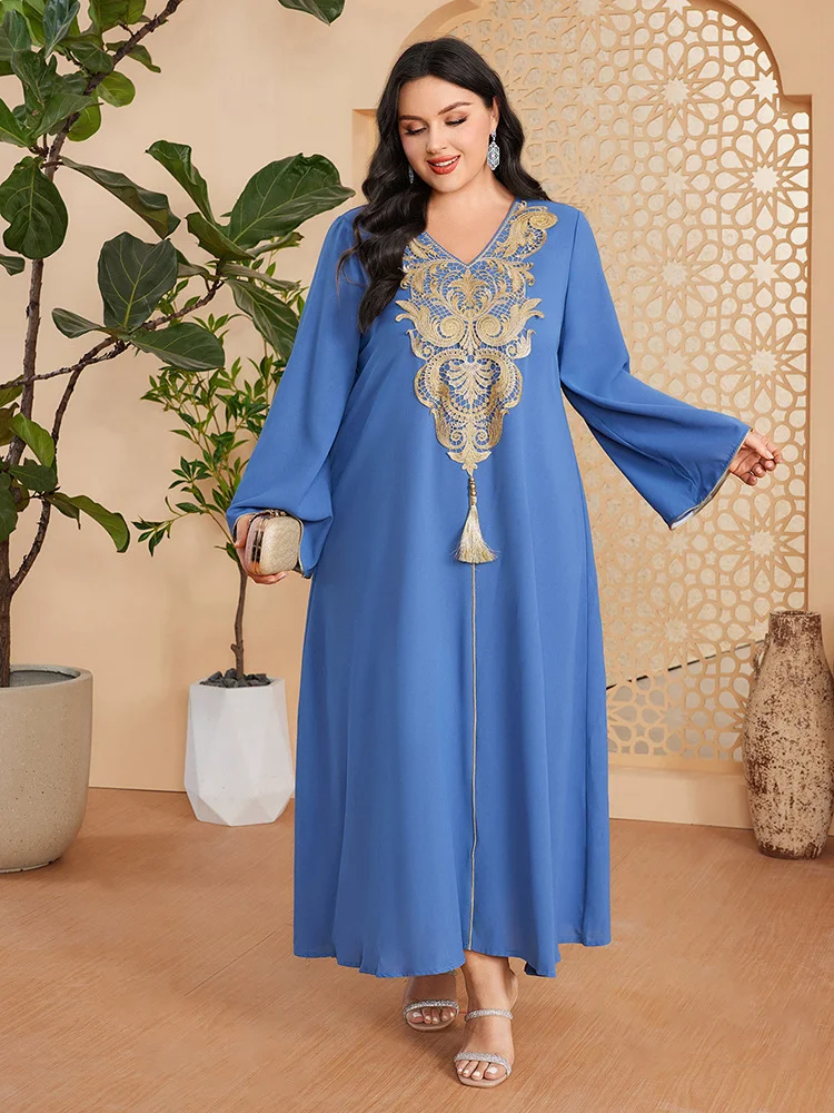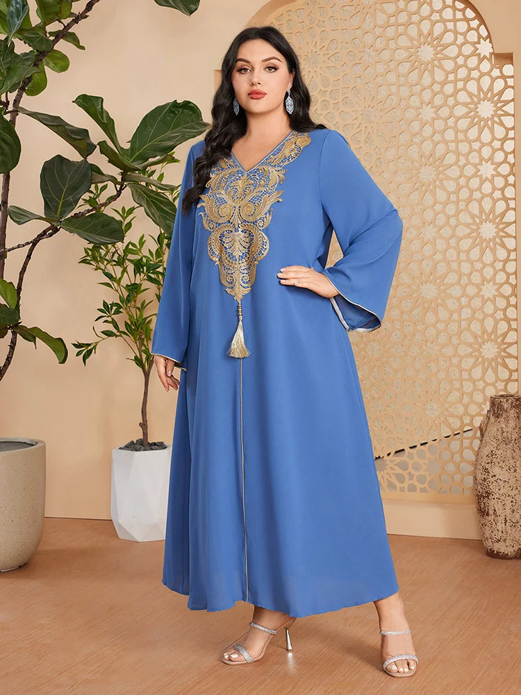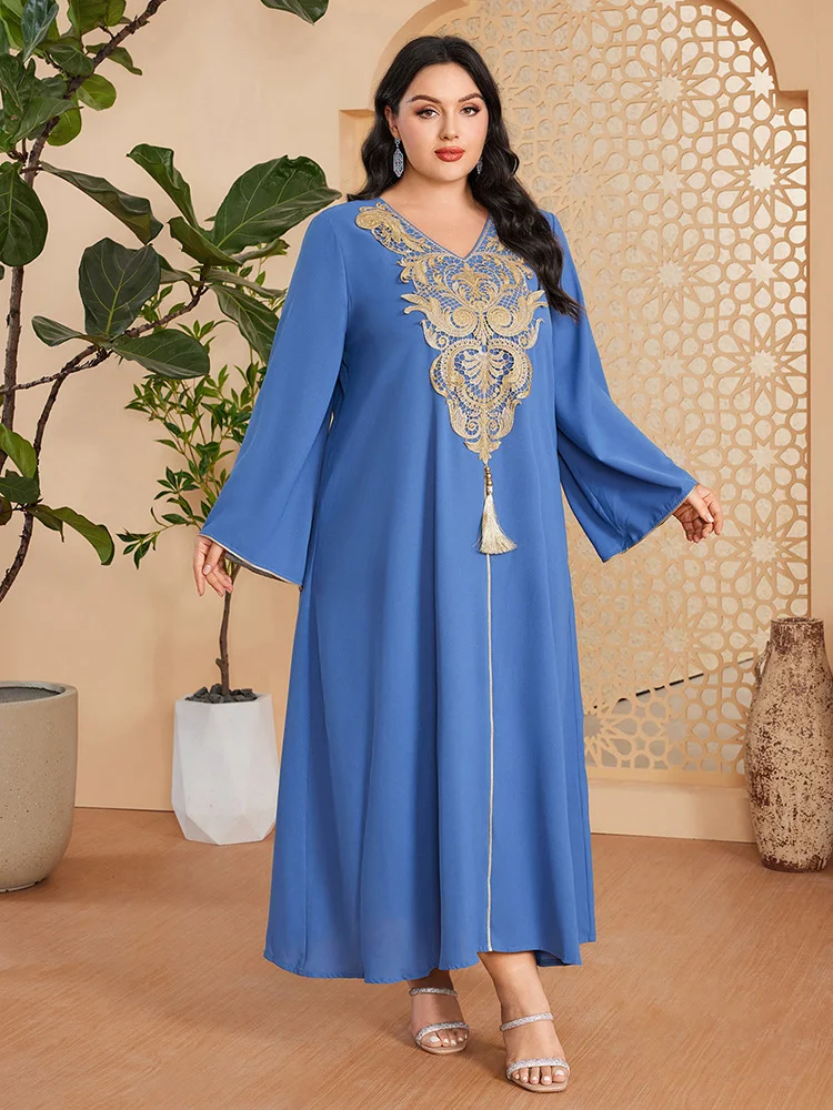 New Wholesale Middle East Applique Muslim Elegant Party Dinner Gown Long Sleeve V-neck Dress