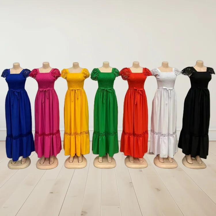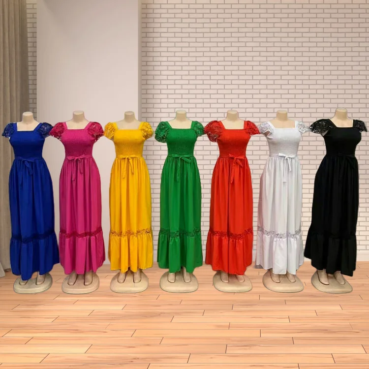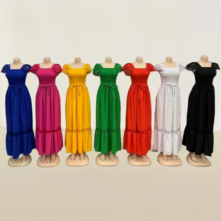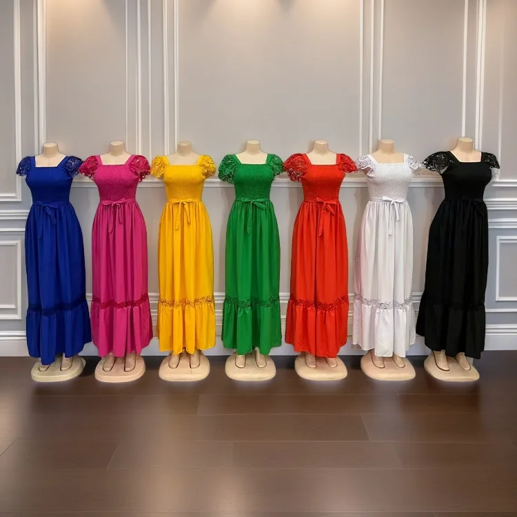 New Women's Summer Lace Hollow Out Short Sleeve Square Collar Ruffled a Harness Waist Dress