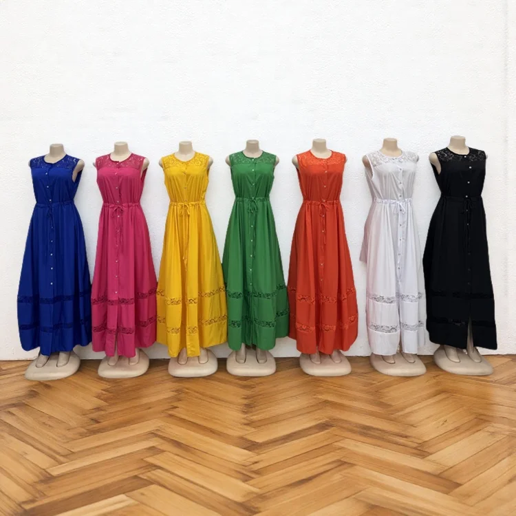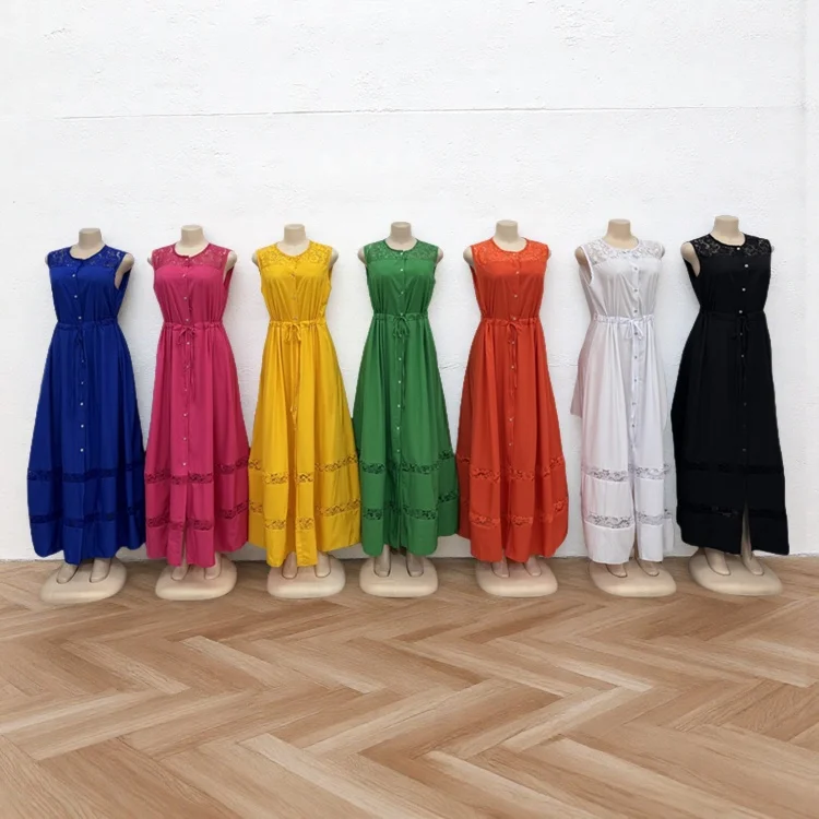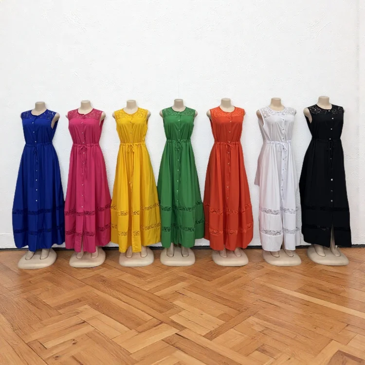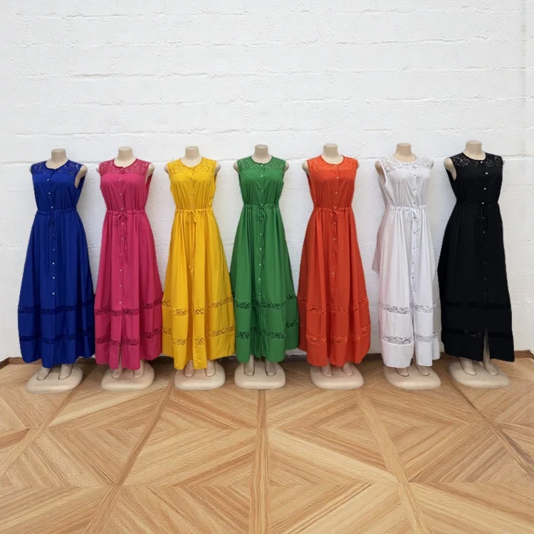 Women's Elegant Hollow Crochet Lace Evening Dress Belted Long Dress Party Casual Sleeveless Dress