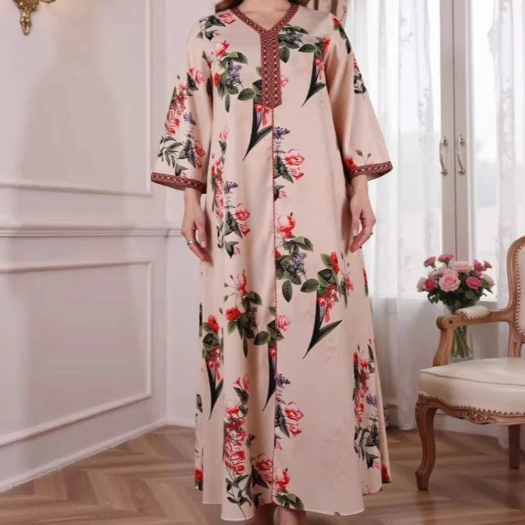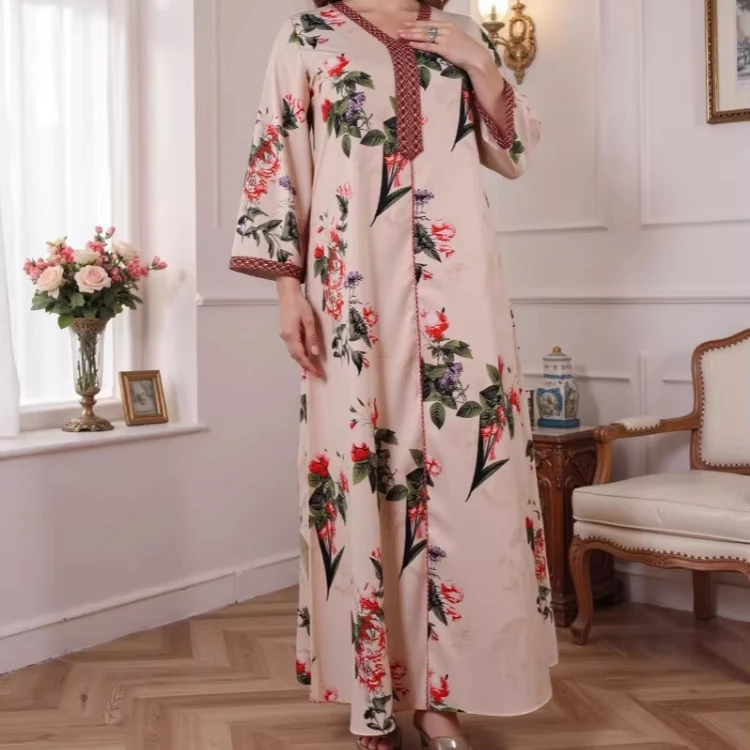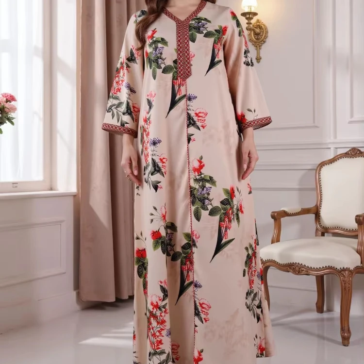 New Wholesale Middle East Women Abaya Muslim Robe Floral Print Long Sleeve Casual Dress