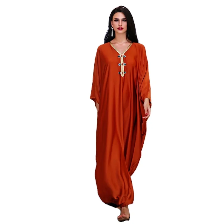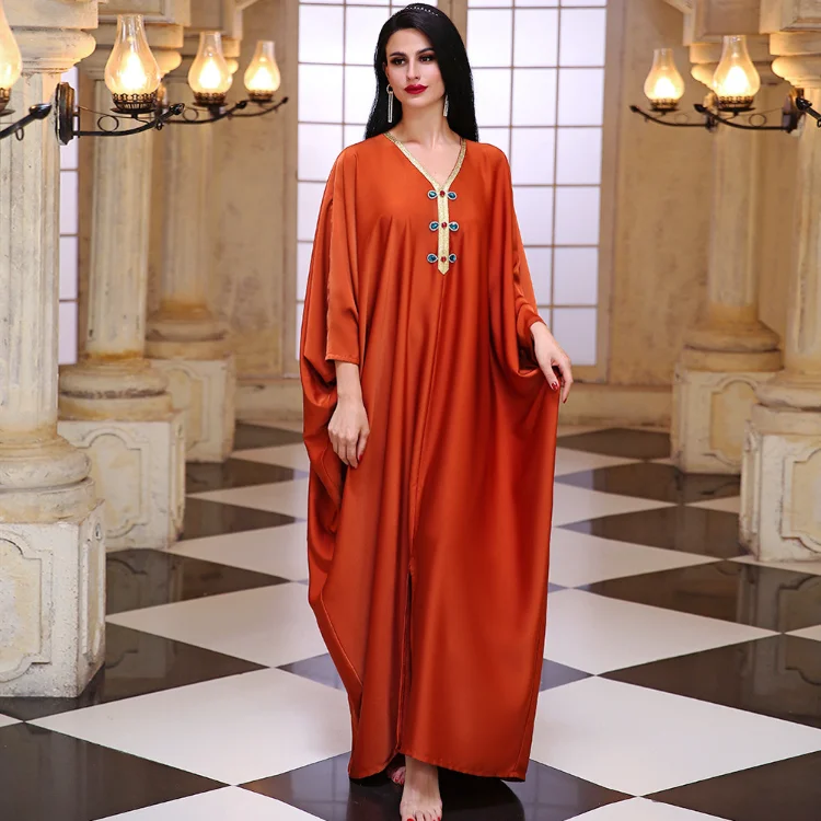 New Arrival Gold-Edge Satin Hand-stitched Glass Diamond Muslim Robe Loose Bat Sleeve Poncho Dress