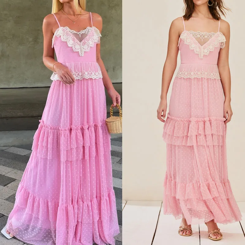 Custom Fashion Lace Trim Casual Summer Comfortable Mesh Pink Women Elegant Maxi Dresses
