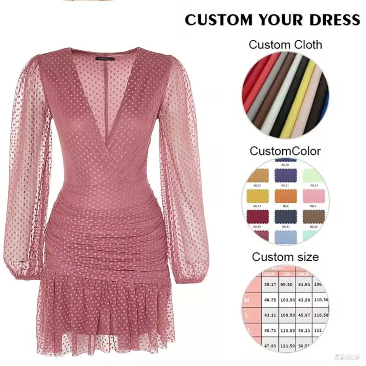 Custom Lady Party Dress V-Neck Wrap Mesh Ruffled Hem Dot Textured and Ruched Mini Casual Dress Women's Dresses