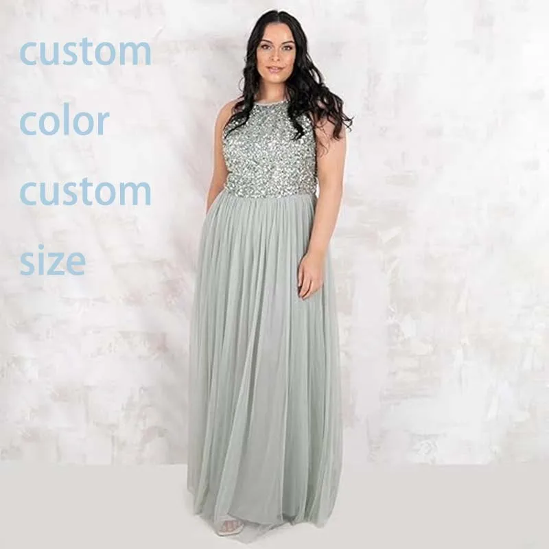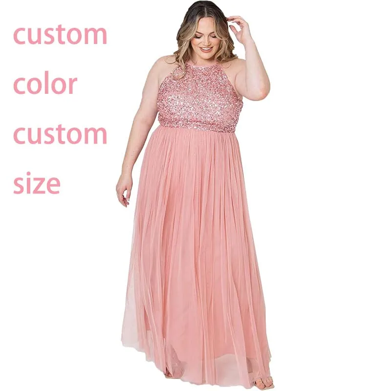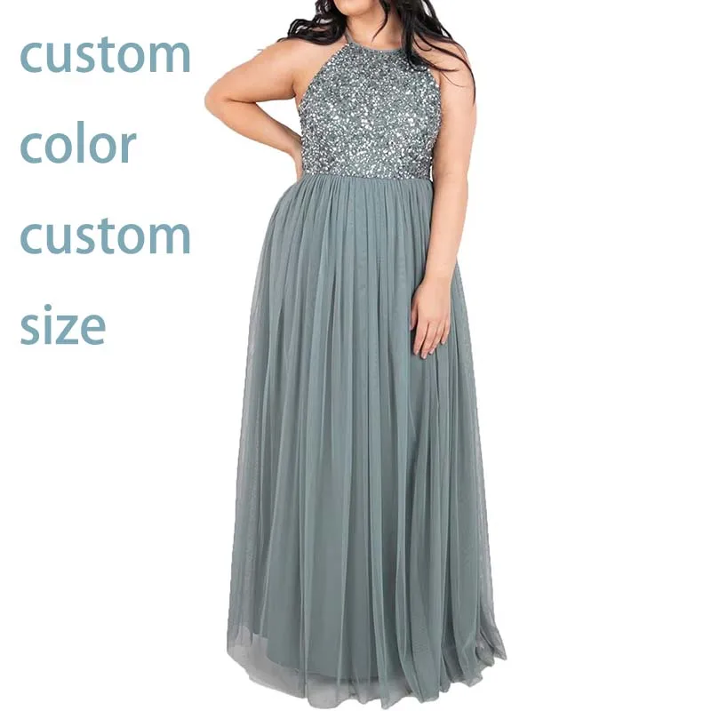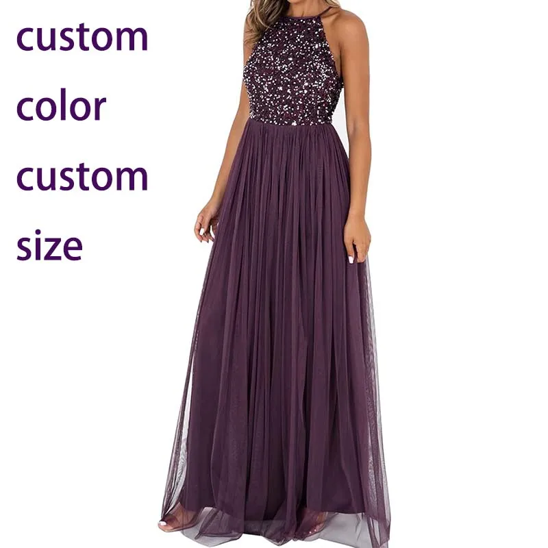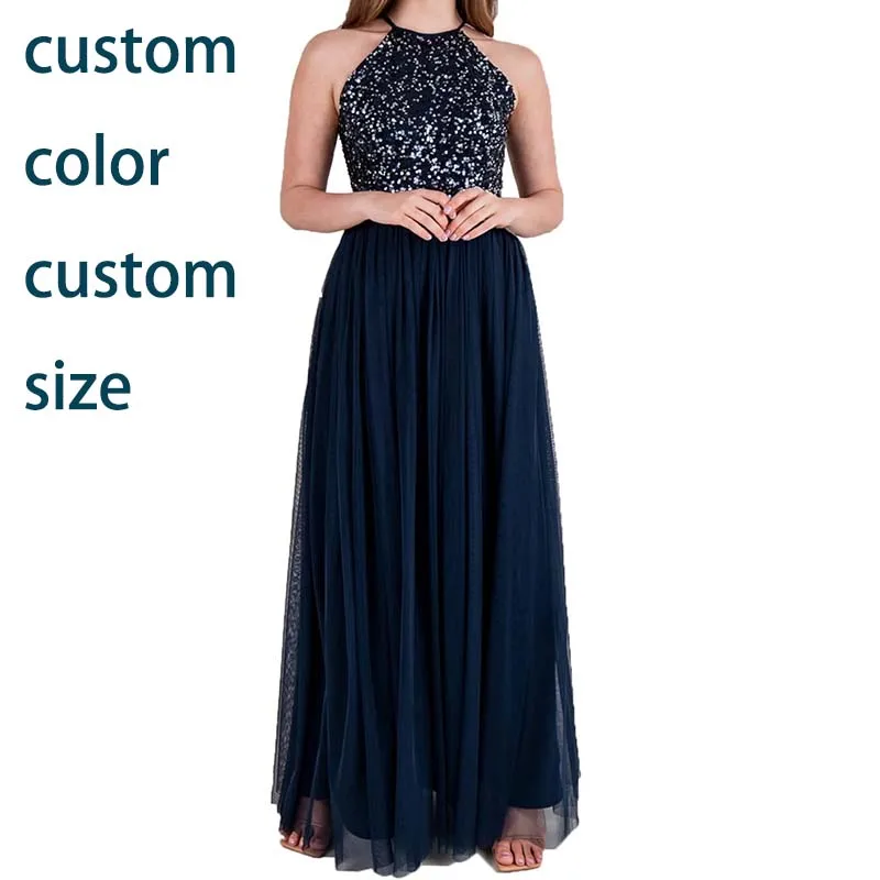 Women's Ladies Bridesmaid Maxi Dress Halter Neck Sequin Embellished Prom Graduation Wedding
