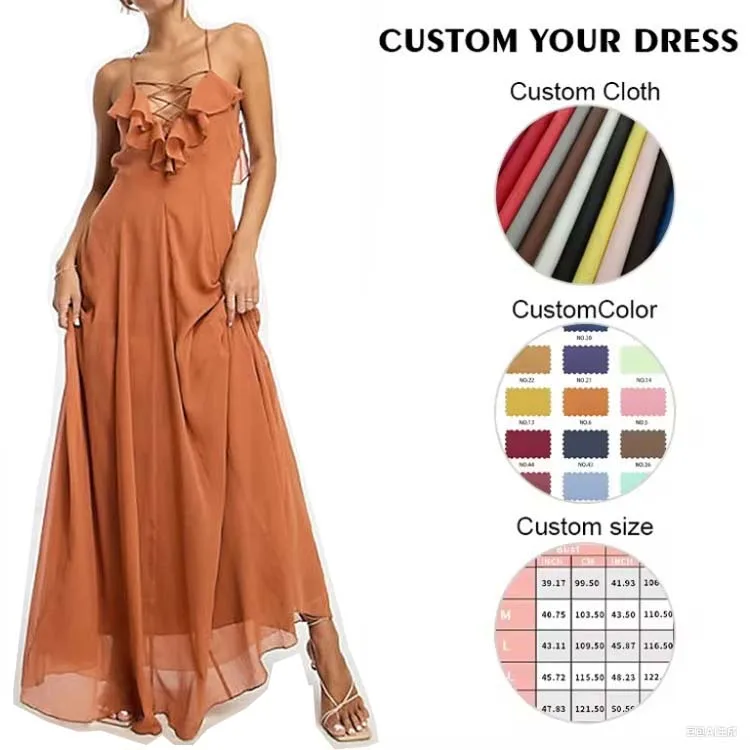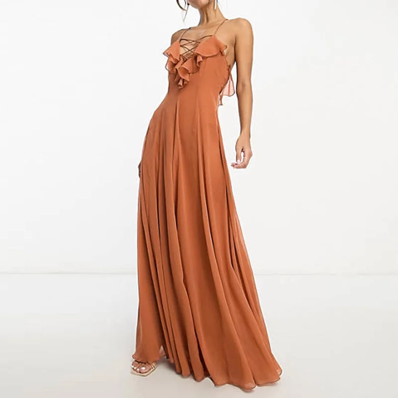 New Vintage Arrival Women's Plunge Neck Lace up Ruffle Front Backless and Tie Back Rust Cami Maxi Dress
