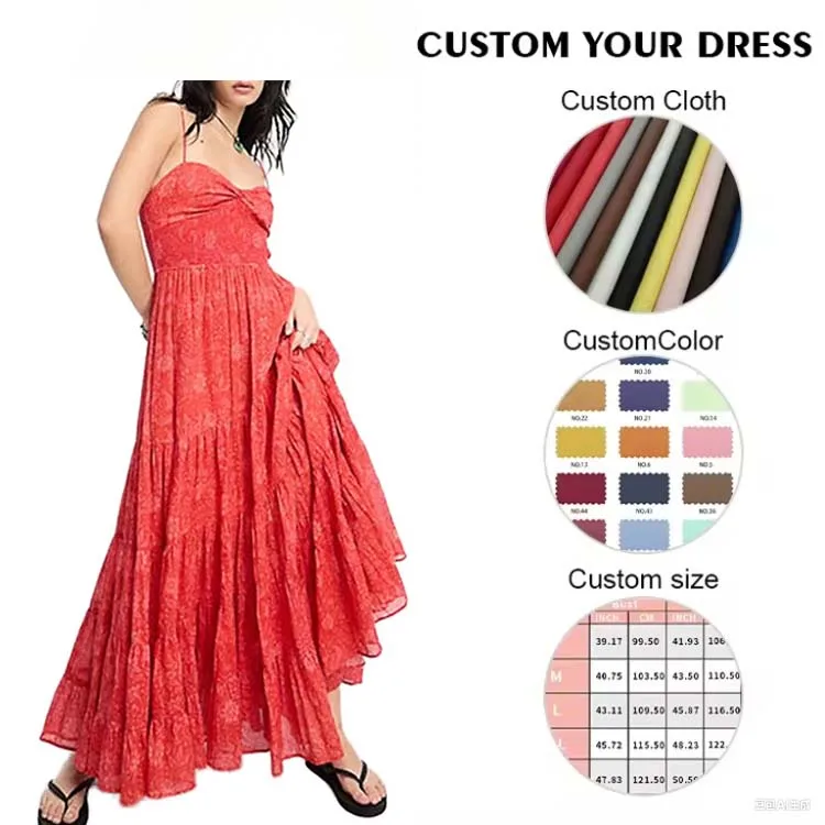 New Selling Women's Sweetheart Neck Sleeveless Floral Print Strap Tiered Red Max Long Dress Casual