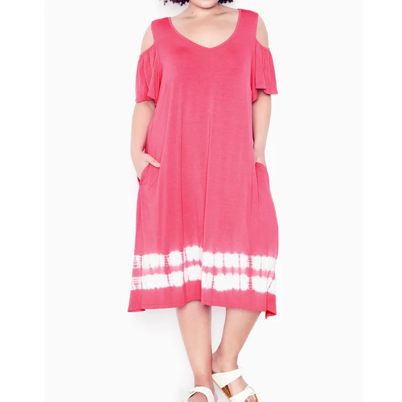 Custom Design Cut Out Shoulder Side Pockets Summer Women Pink Casual Plus Size T-shirt Dresses