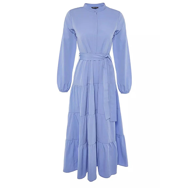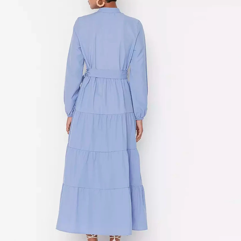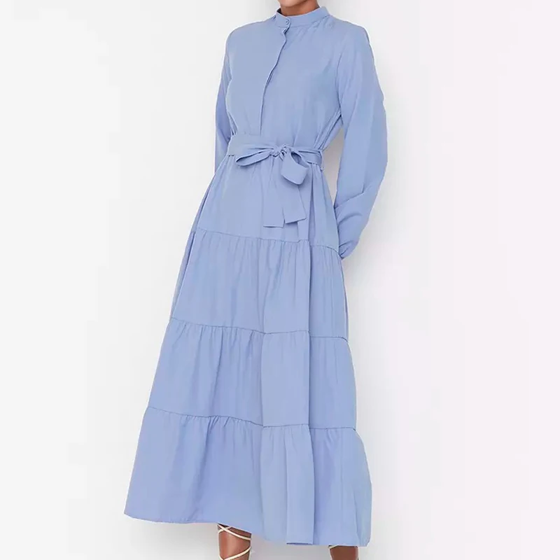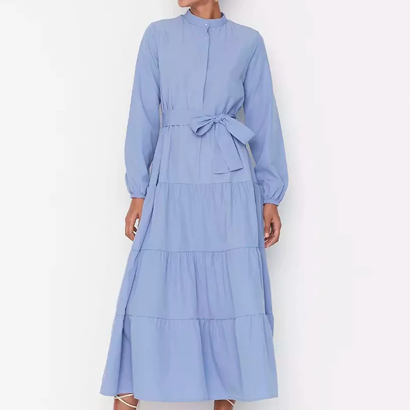 Lady Autumn Style Long Sleeve Tiered Hem Maxi Dress With Solid High Neck Belted Casual Wear Women's Dresses