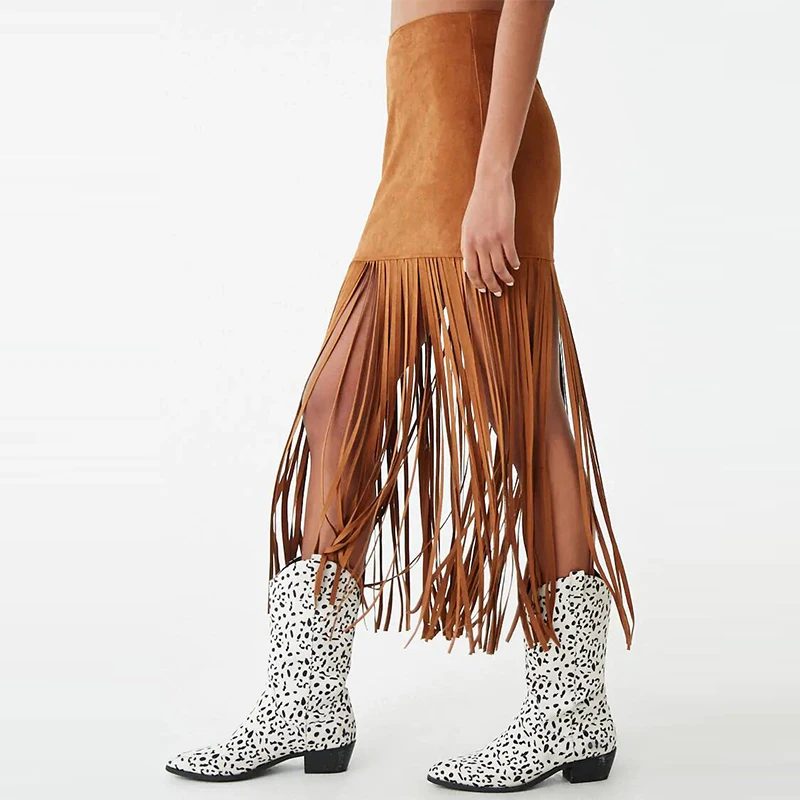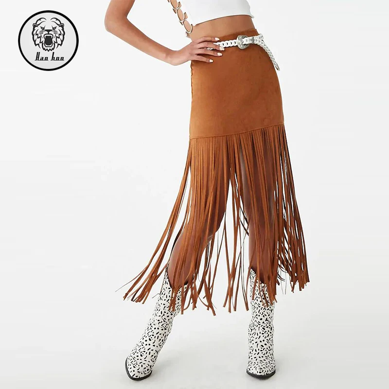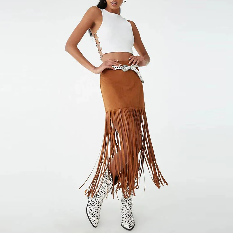 Latest Fashion Casual Style Empire Waistline Faux Suede Fringe Midi Pencil Skirt