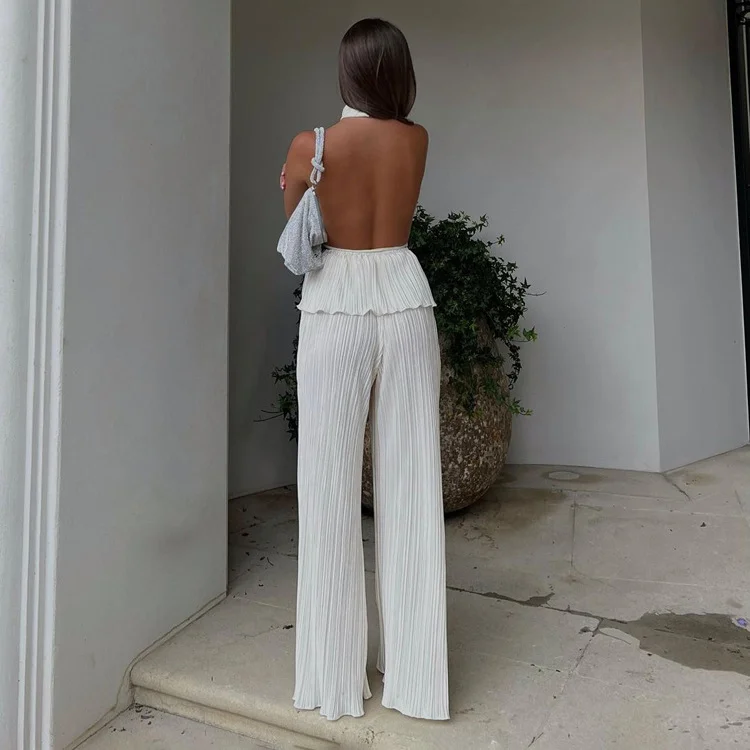 Chic Design Luxurious Summer Halter Sexy Backless Sleeveless Vest High Waist Wide Leg Pants Suit Skinny Top 2 Piece Set Women