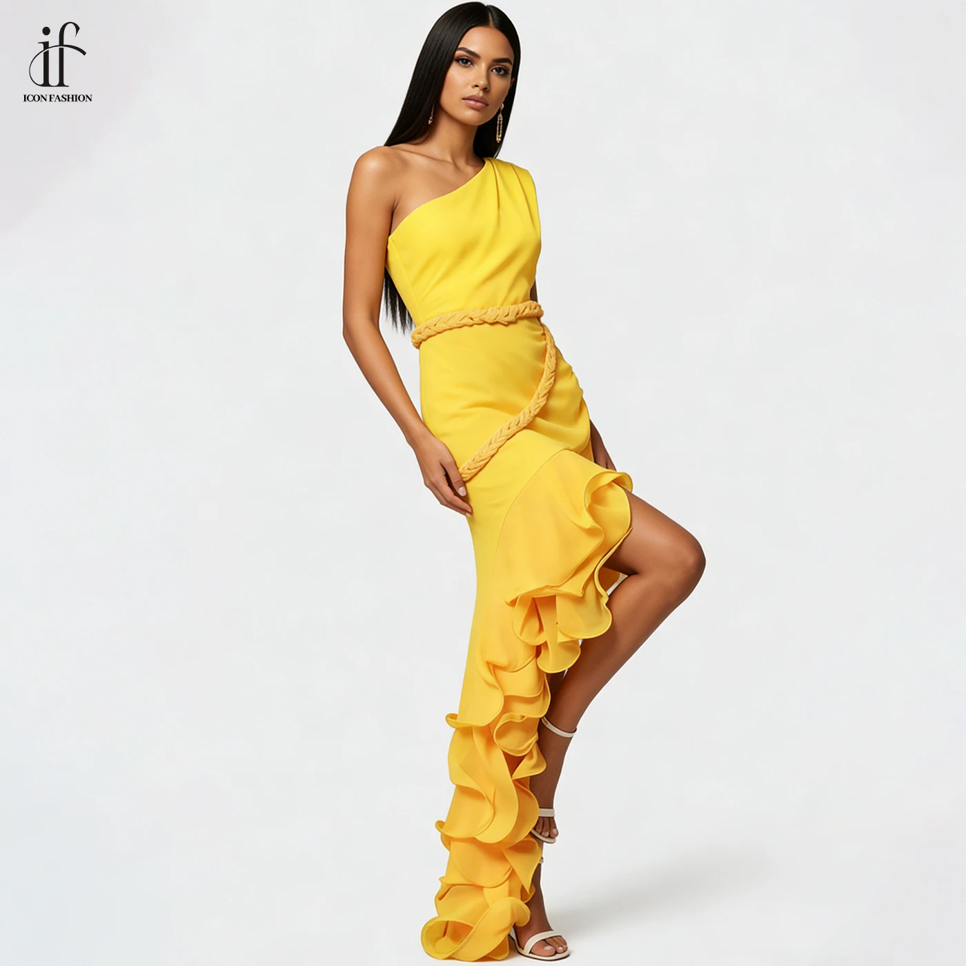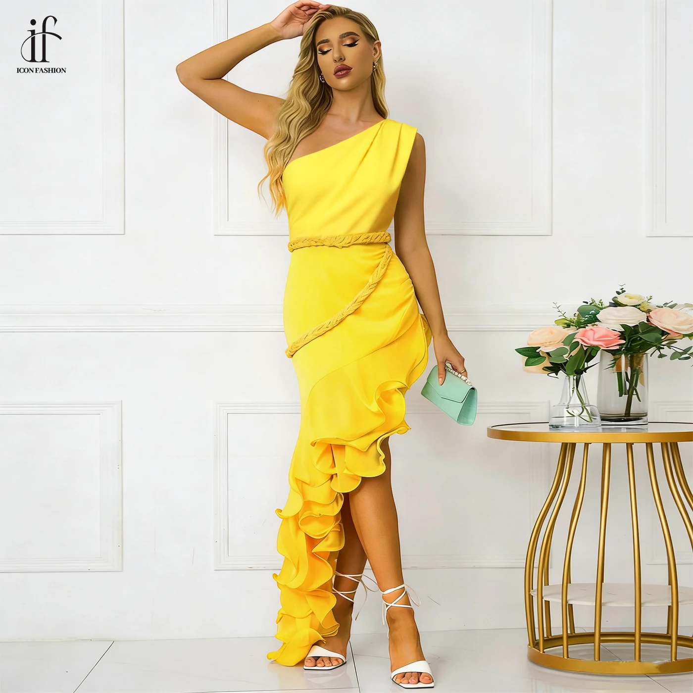 ZYHT 73903 Gemstone Crystal 3D Flower Decoration Ruched One Shoulder High Slit Long Sleeve Maxi Simple Elegant Evening Dress