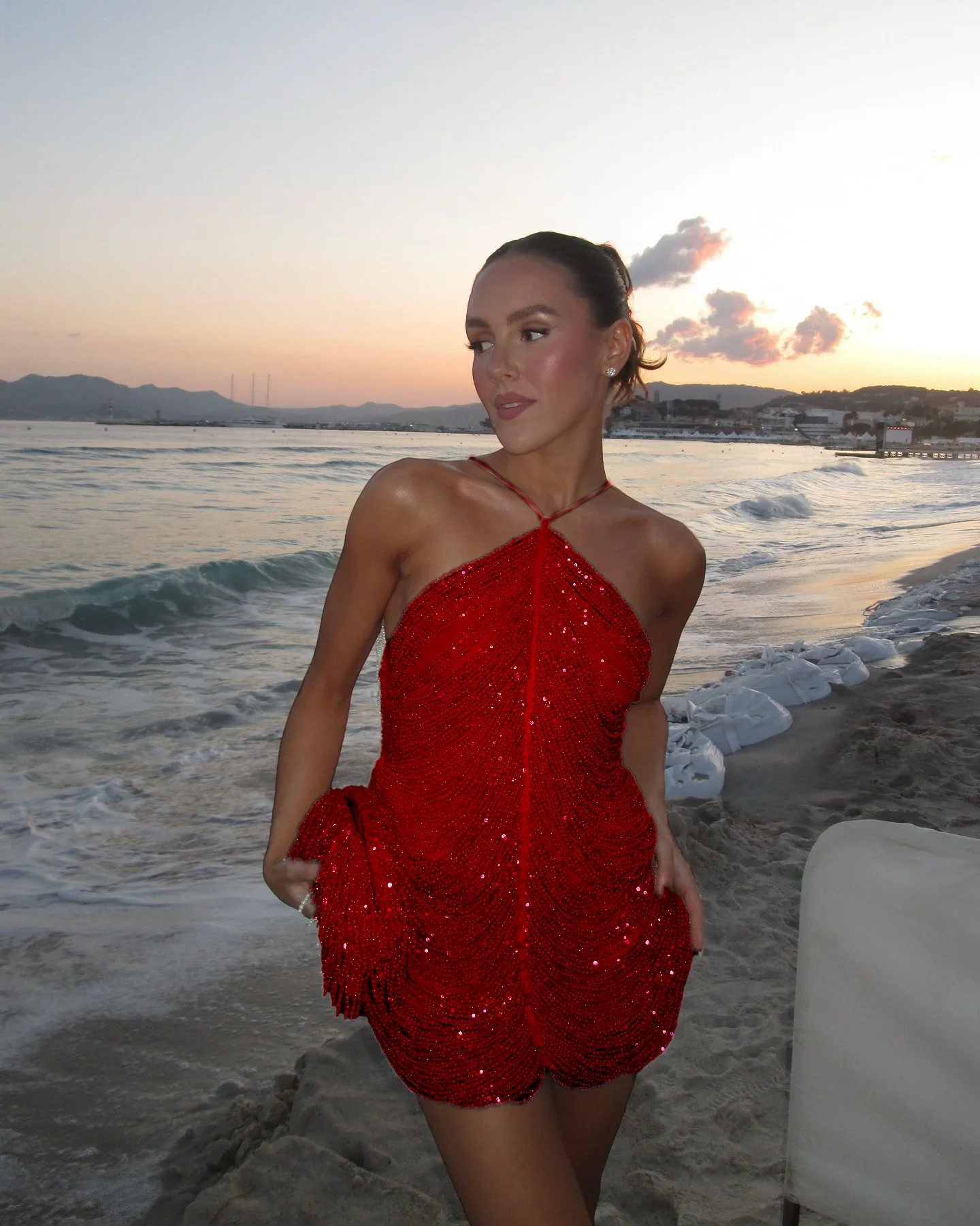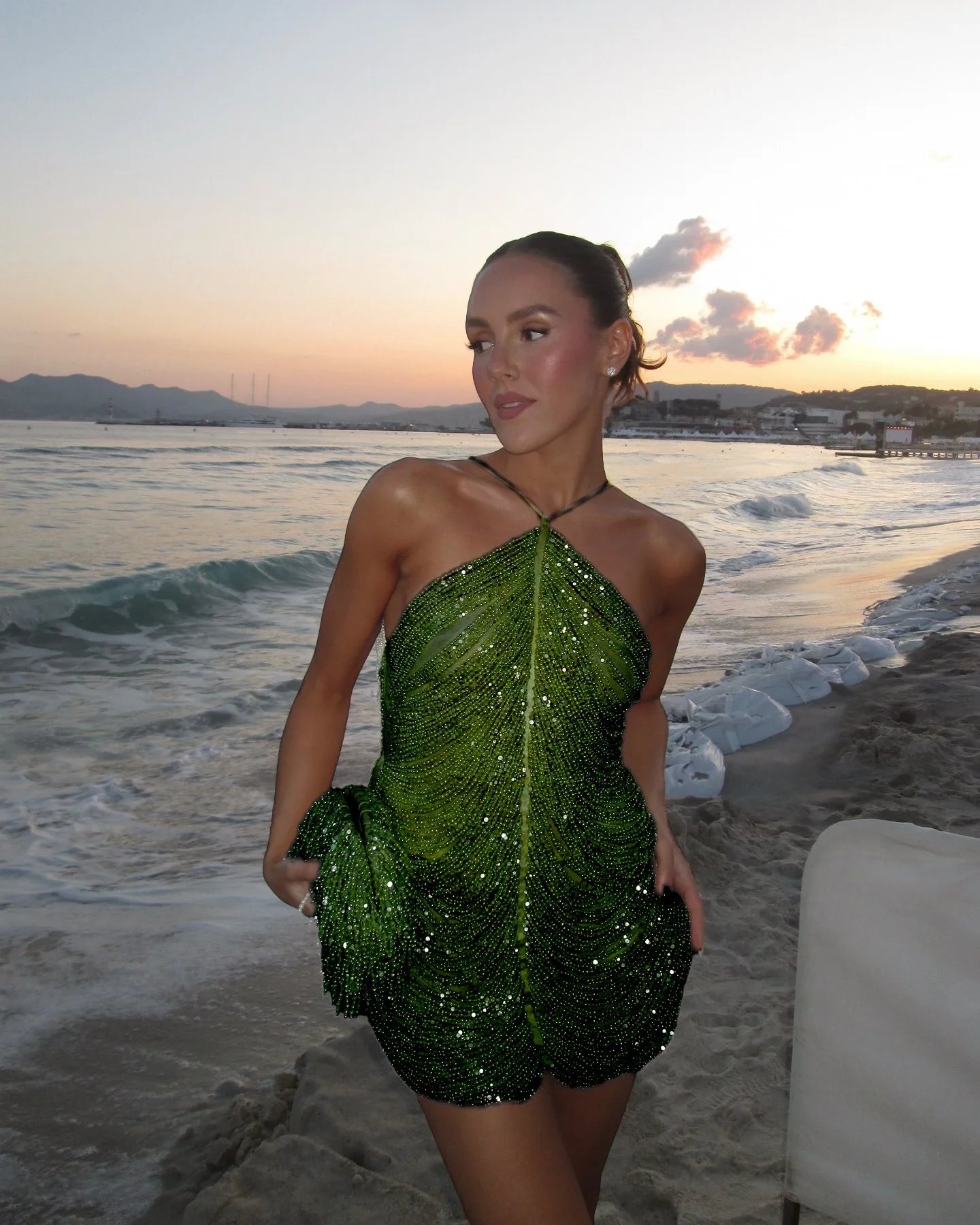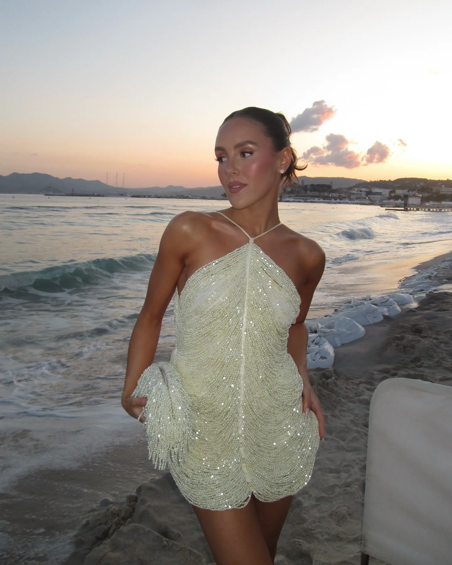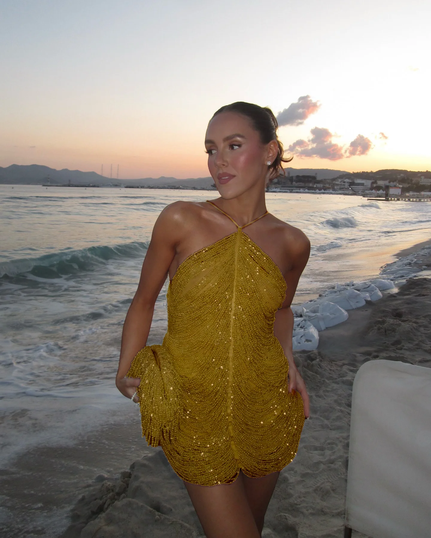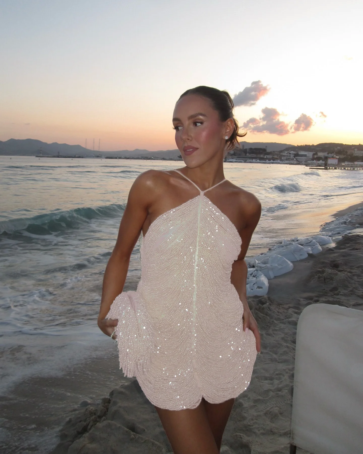 Chic Evening Club Women's Sexy Slim Halter Mini Dress Shiny Beading Sleeveless Backless for Party