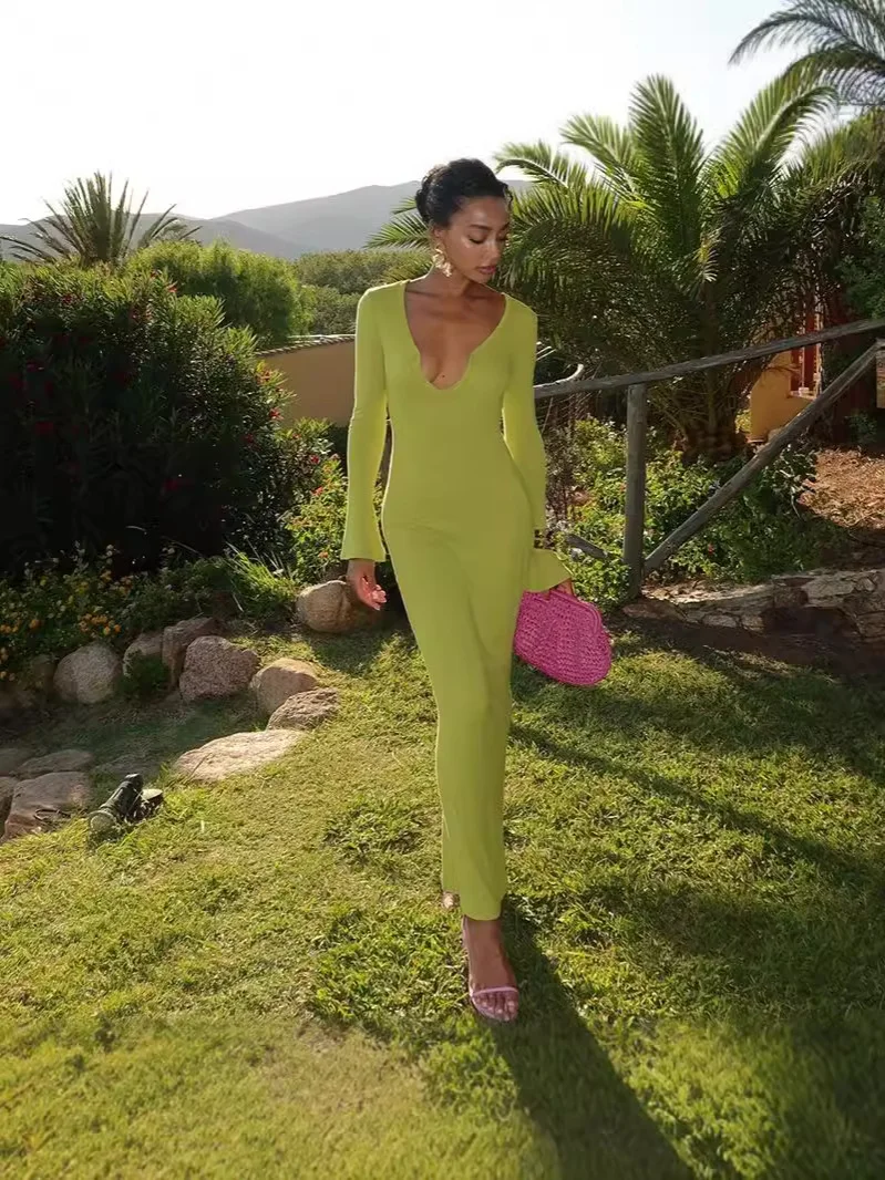 2026 Women's Sexy Slim-Fit Maxi Dress Solid Color V-Neck Long Sleeve Washable Worsted Fabric Natural Waistline for Autumn