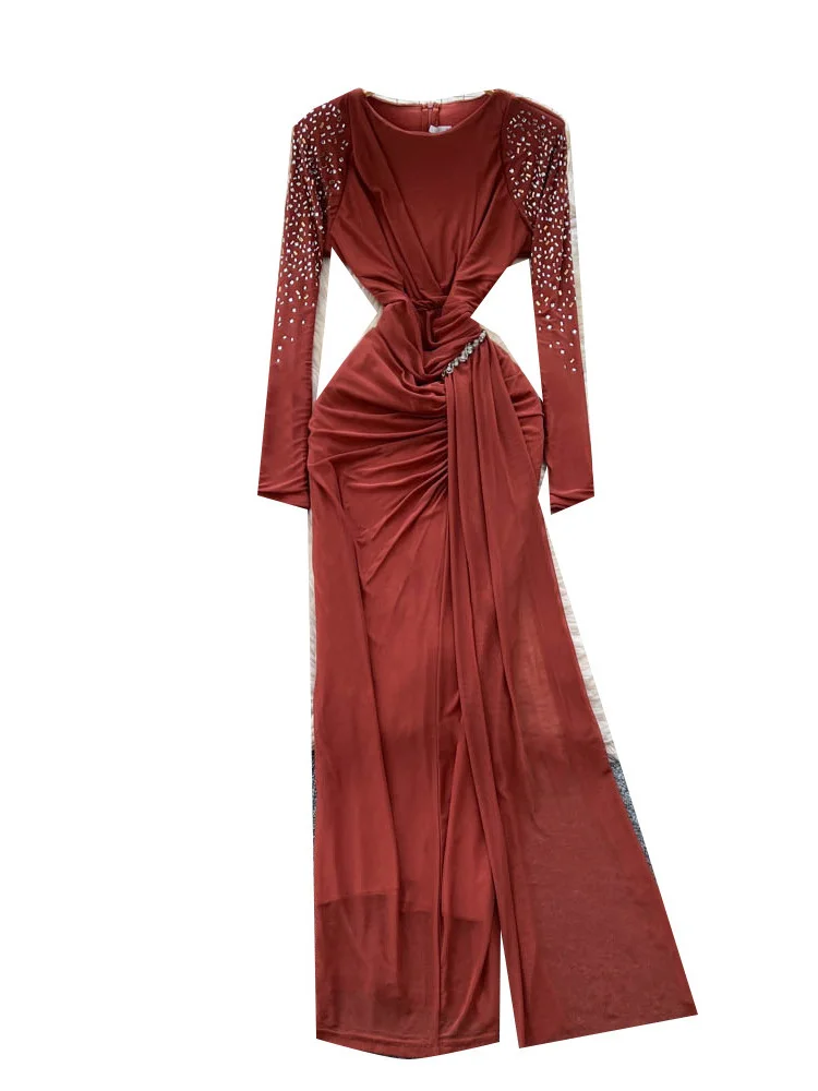 French-style High-End Heavily Embellished Reineston Pleated Long-sleeved Mesh Ribbon Dress for Women Slim Fit