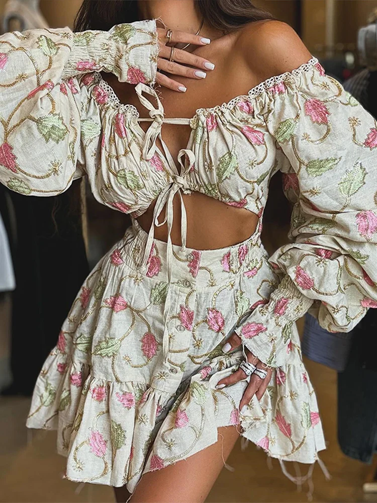 2026 New Fashionable Sweet Plaid Hollow Lace off Shoulder Breathable Plain Dyed Midi Women's Dress