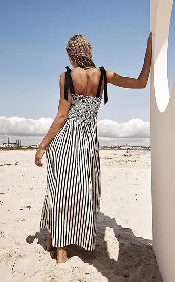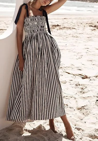 Hot Selling Strap Striped Smocked Elastic Neckline Side Pockets Spaghetti Straps Vintage Style 100% Polyester