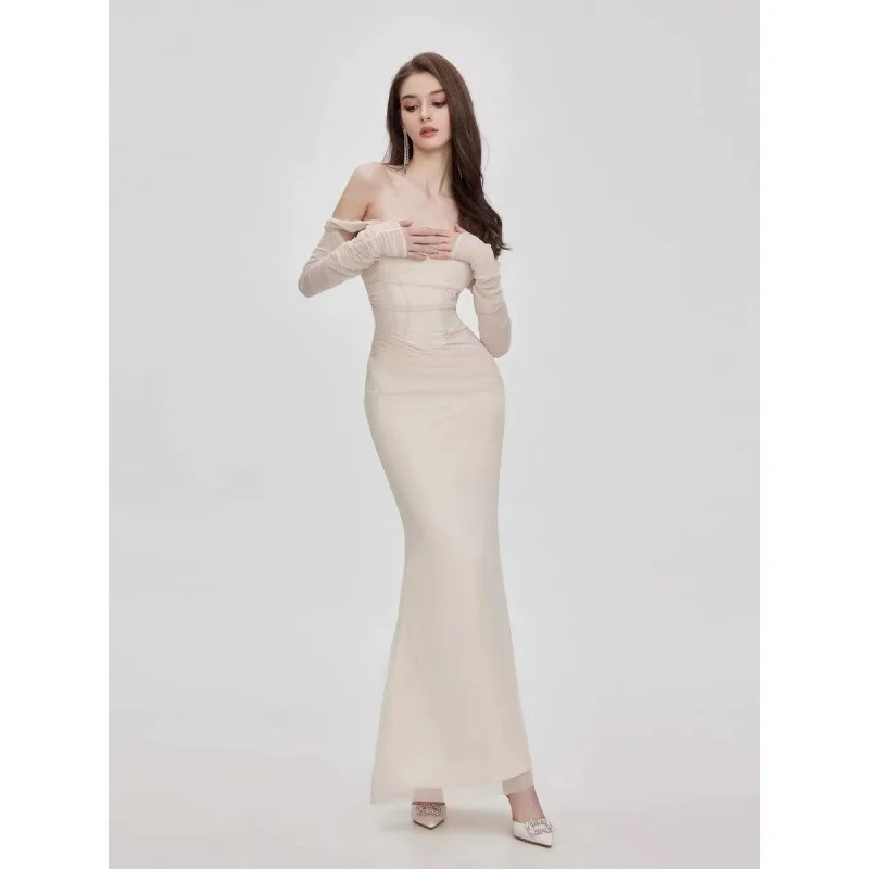 Elegant Summer Cold Shoulder A-Line Floor Length Party Dress Sexy Polyester Design Strapless Evening Dress