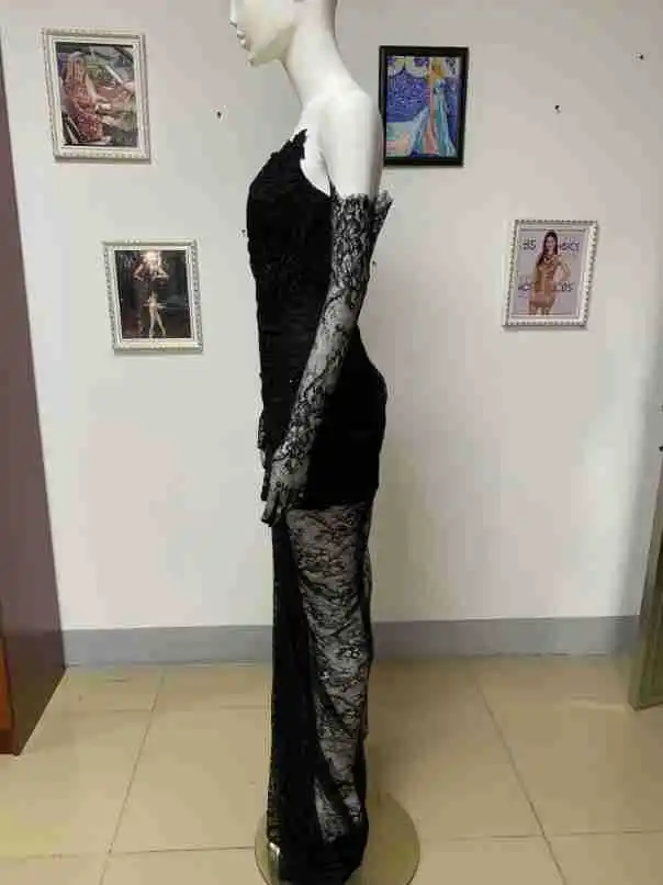 Fashion Black Lace Strapless Evening Gown High Slit Sexy off Shoulder Prom Dress for Women's Birthday Runway Party Wear
