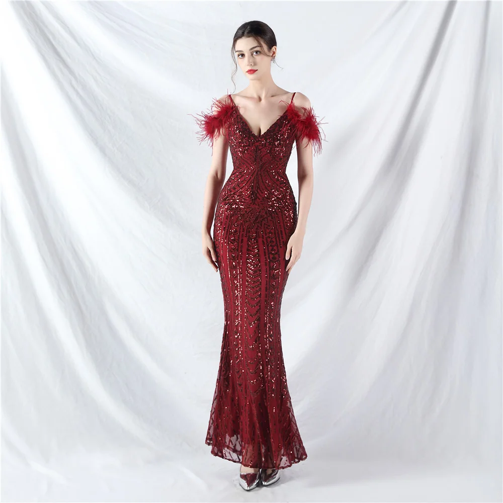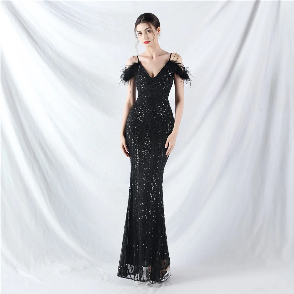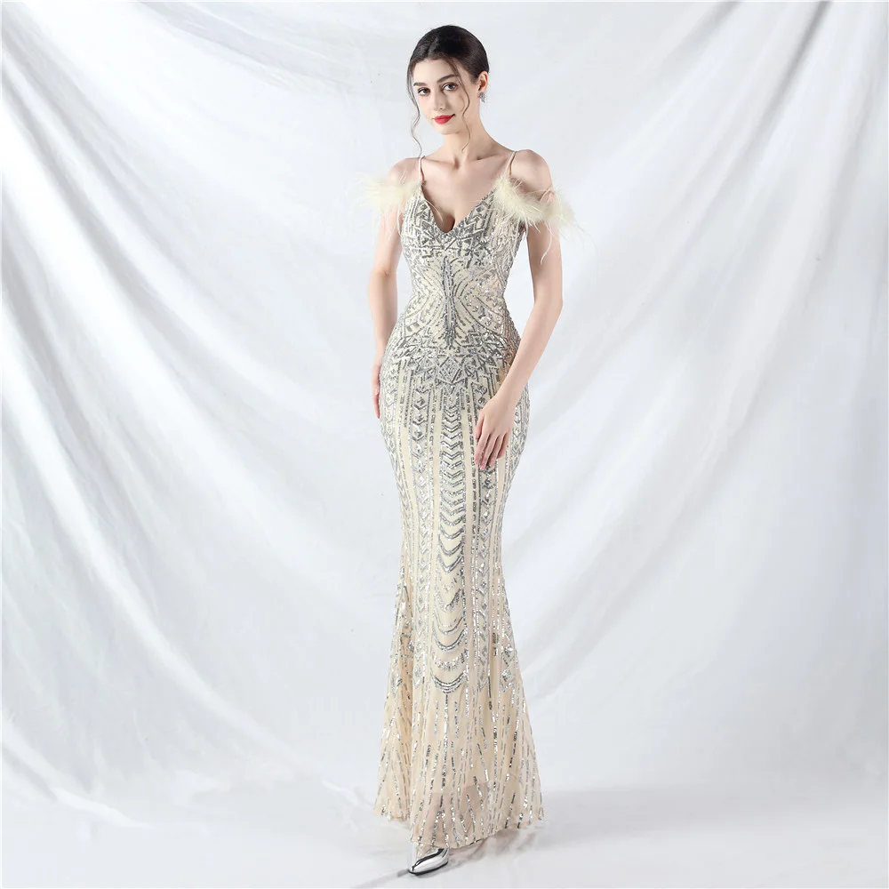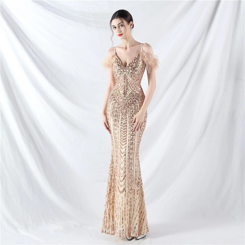Elegant Slim-Fit Fishtail Evening Dress Long Banquet Flower Sequin Sling Natural Waistline Anti-Static Breathable