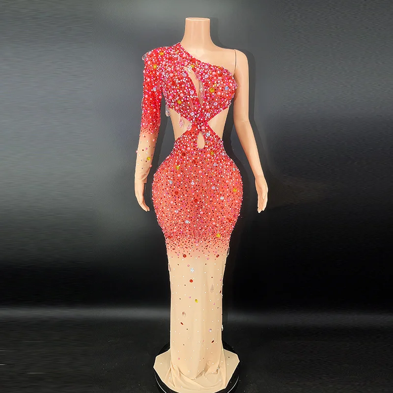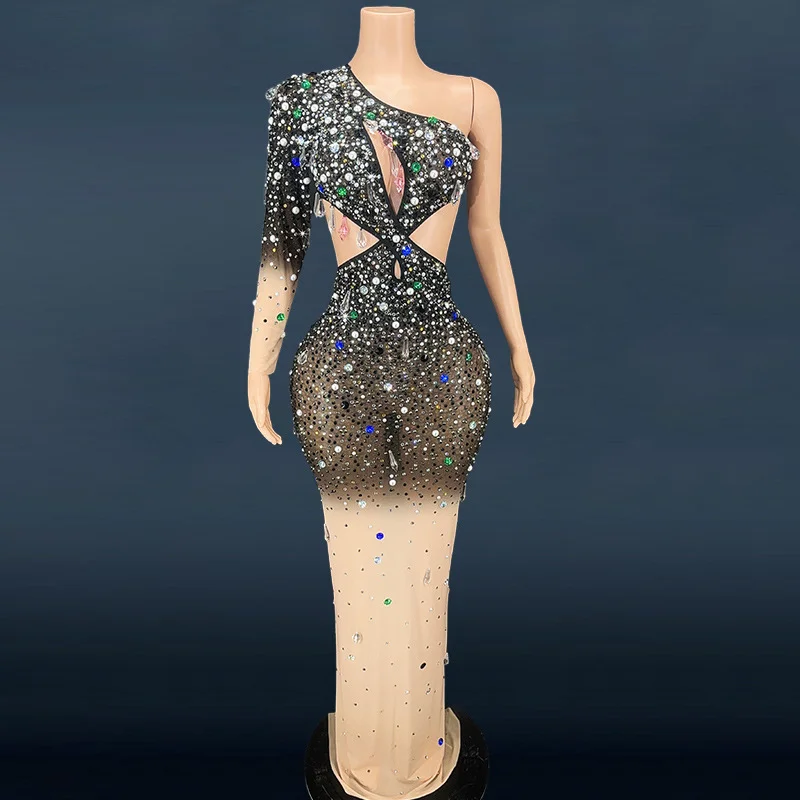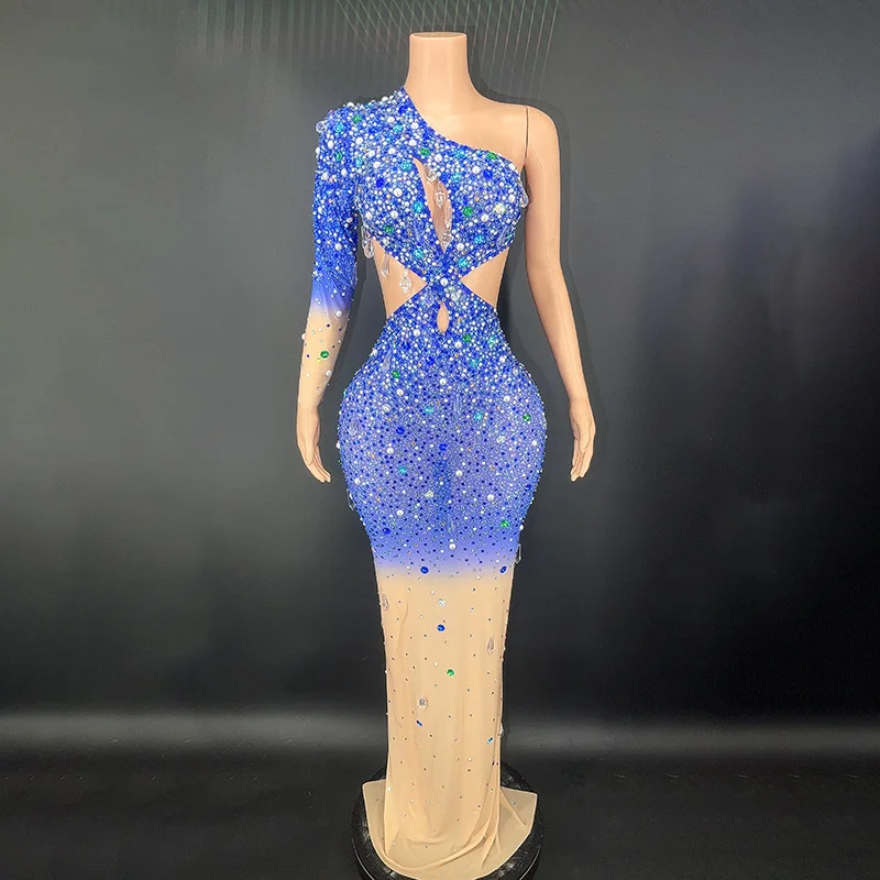 Women's Blue Rhinestones Evening Dress Modern Romantic Sexy Hollow Fashion Birthday Party Dress Floor-Length Mesh
