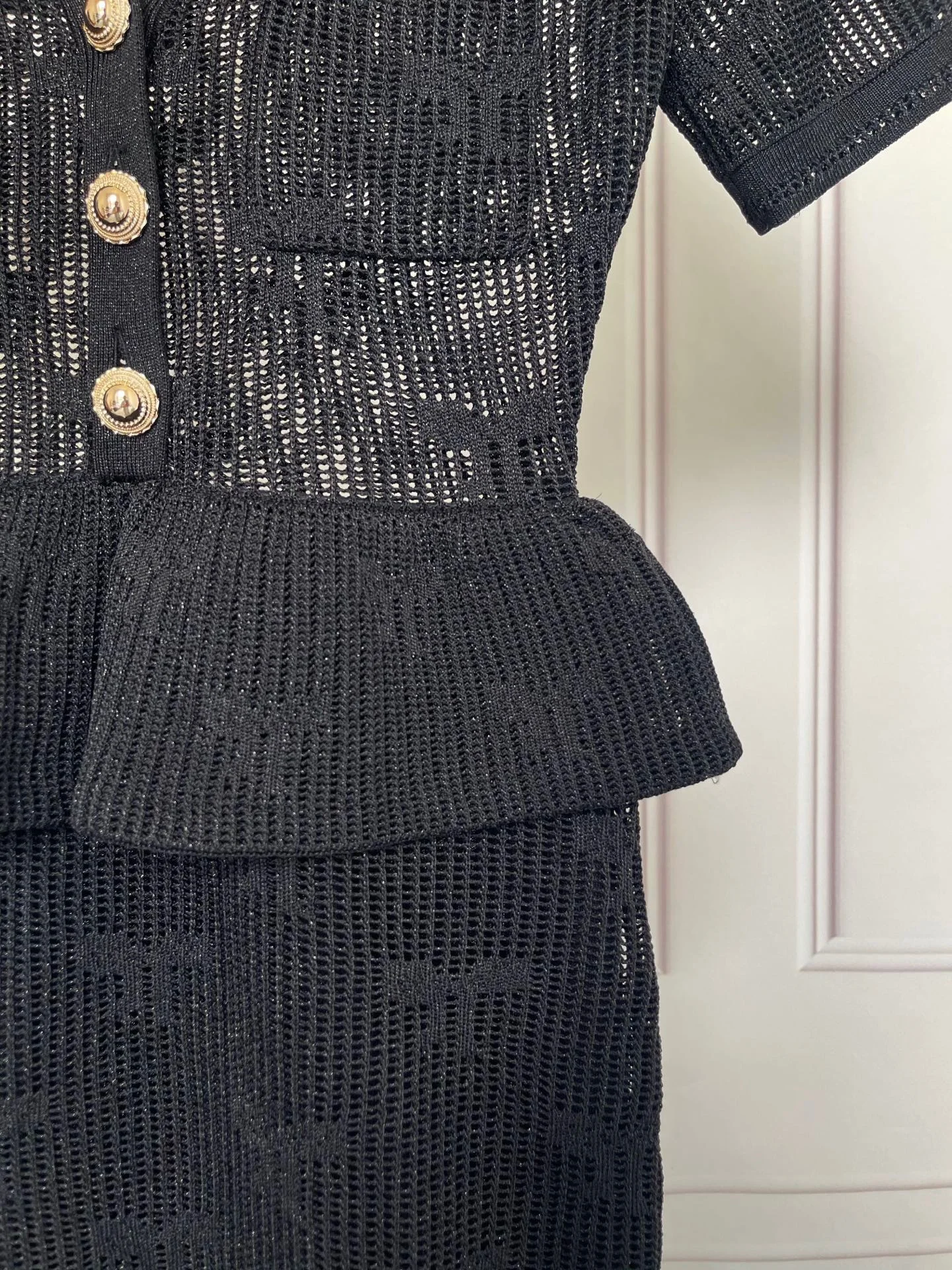 ZYHT 21938 Black Velvet Mini Dress Square Neck Long Puff Sleeves with Pearl Trim & Crystal Dess Flared Scalloped Hem Dresses
