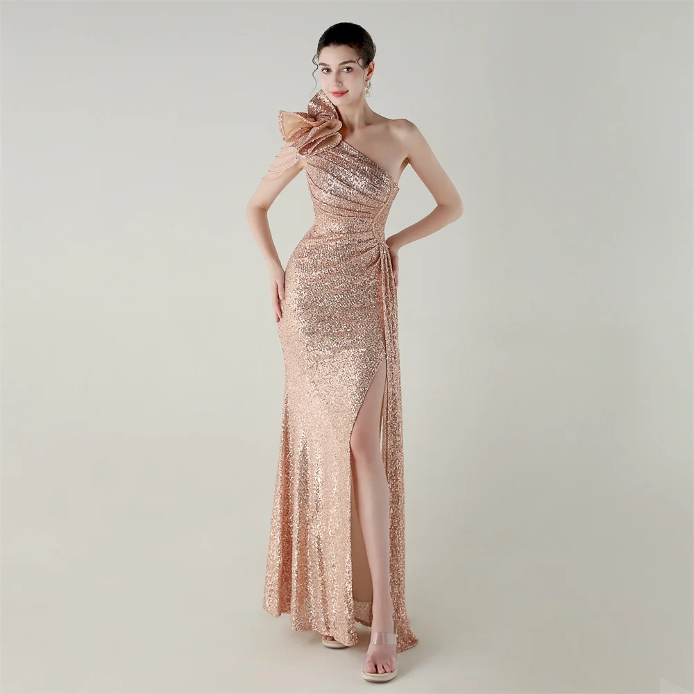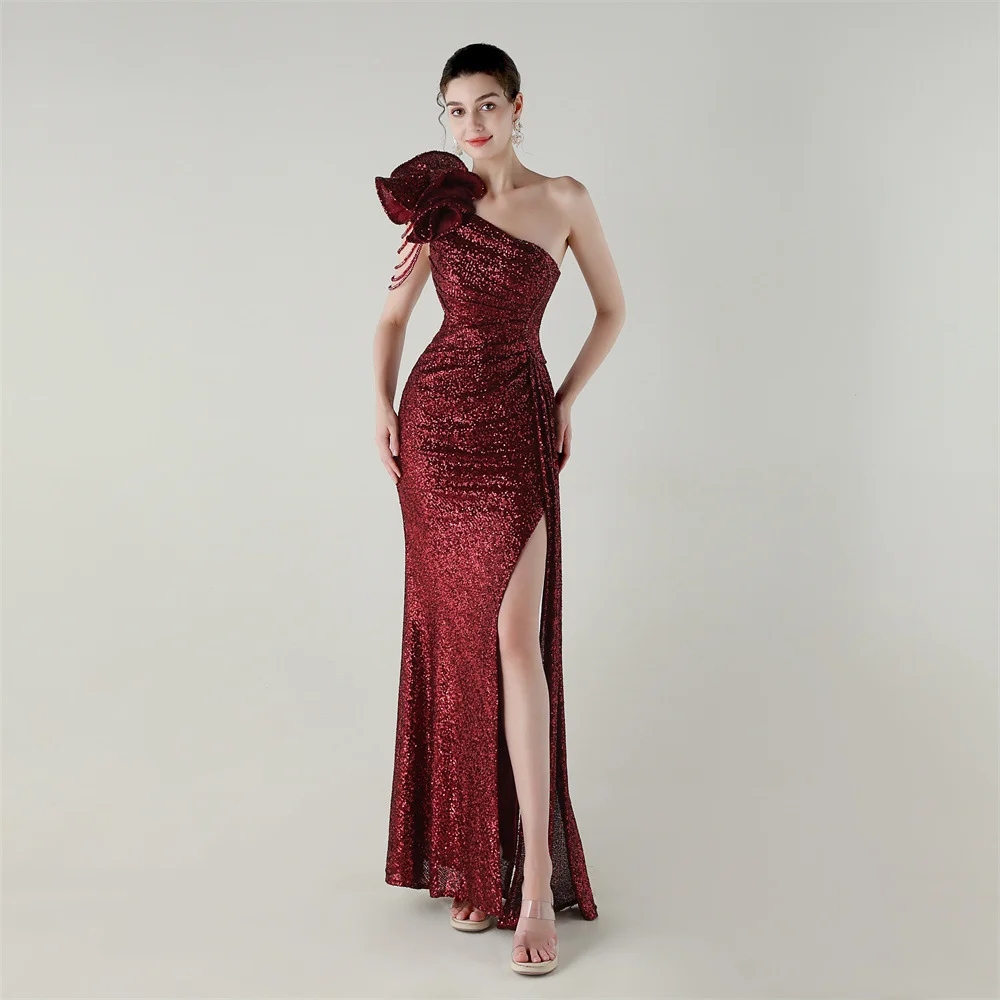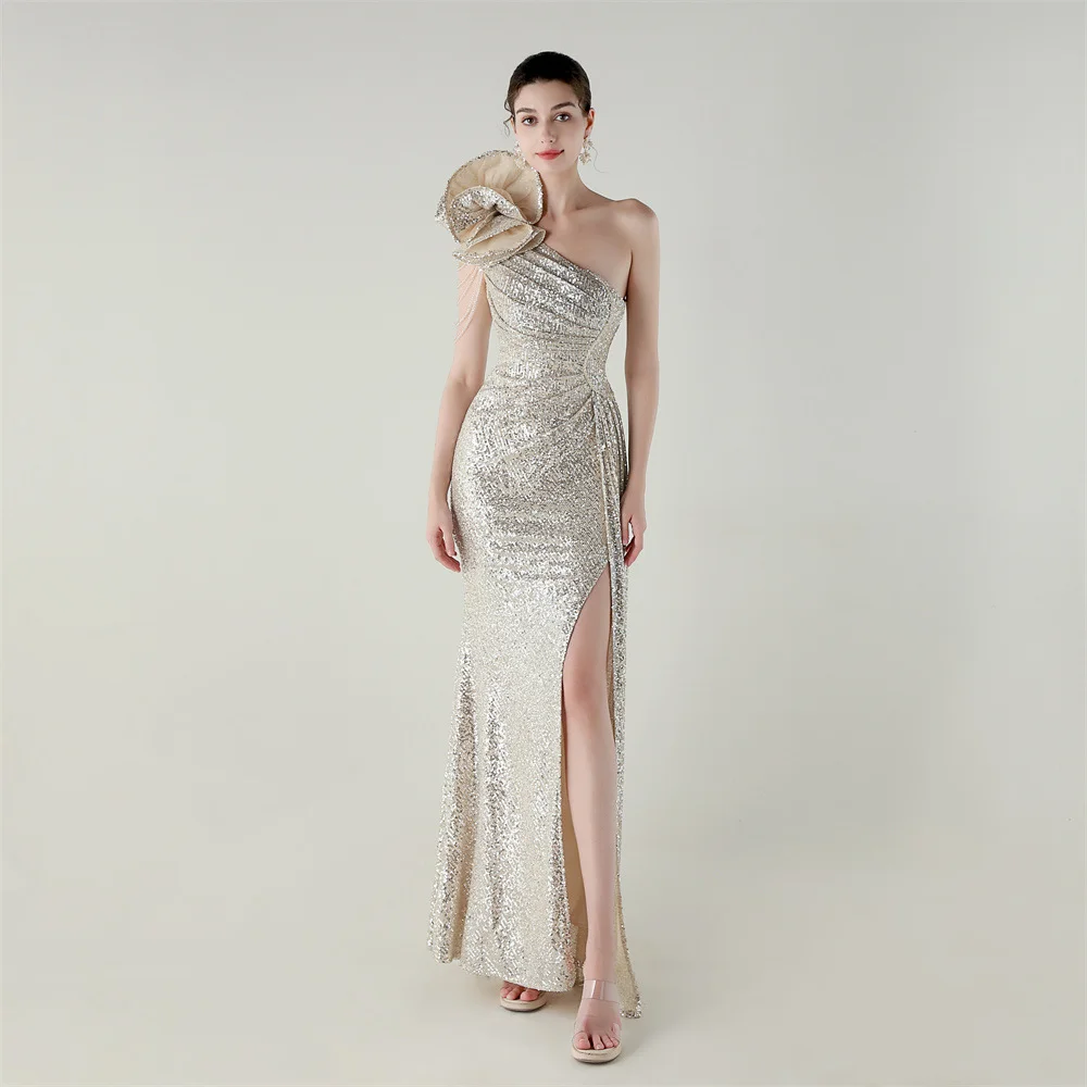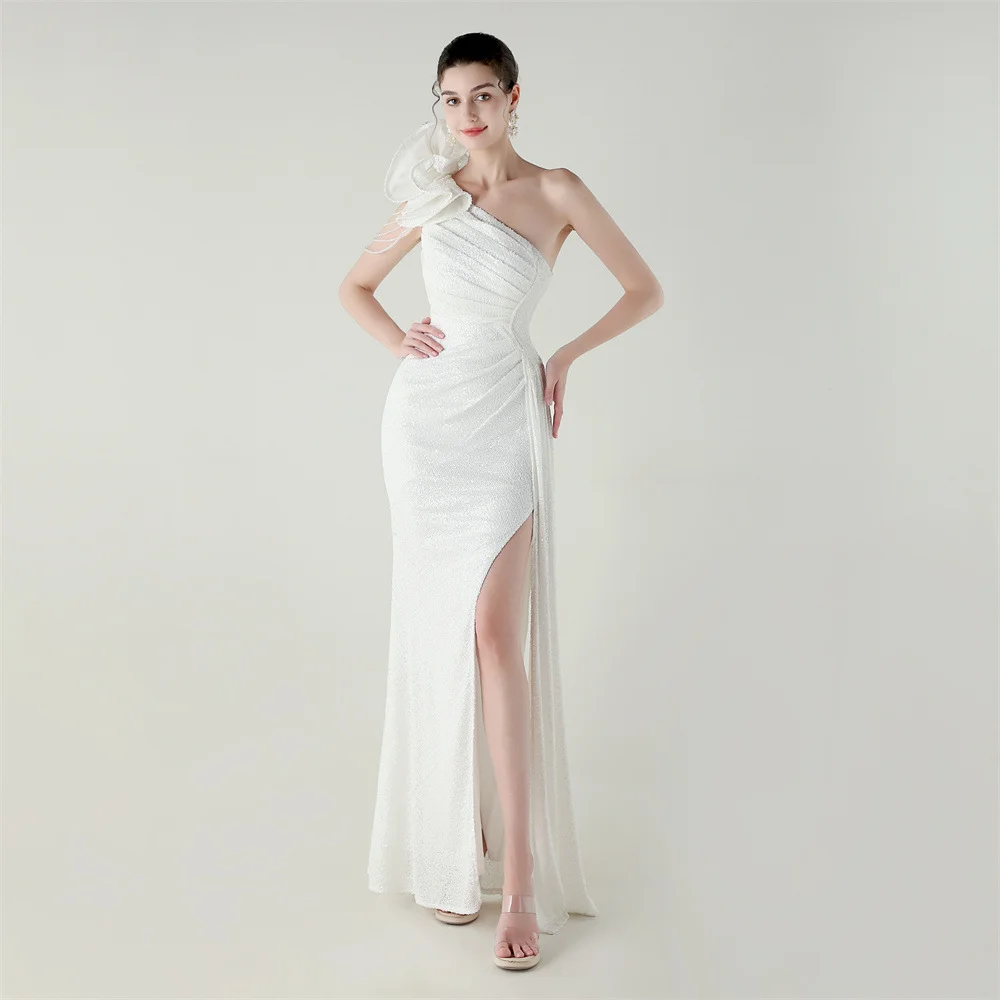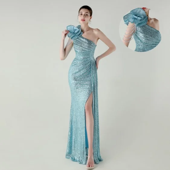 ZYHT 73903 Gemstone Crystal 3D Flower Decoration Ruched One Shoulder High Slit Long Sleeve Maxi Simple Elegant Evening Dress