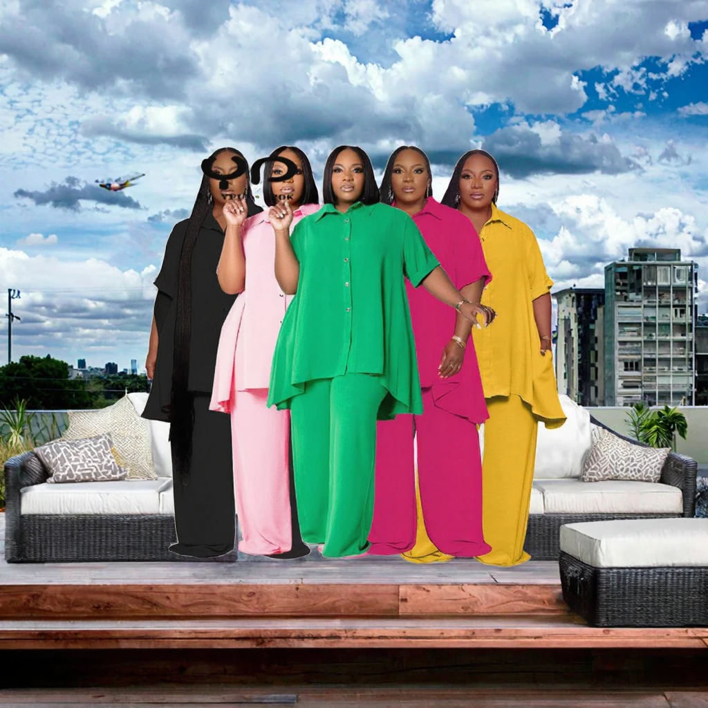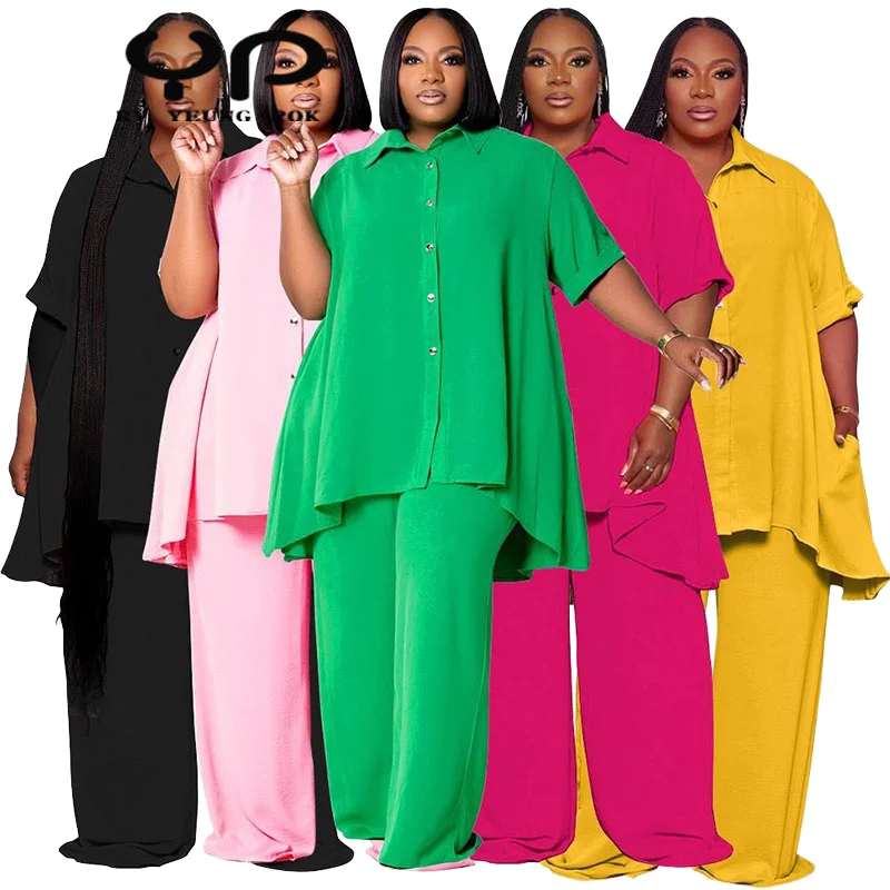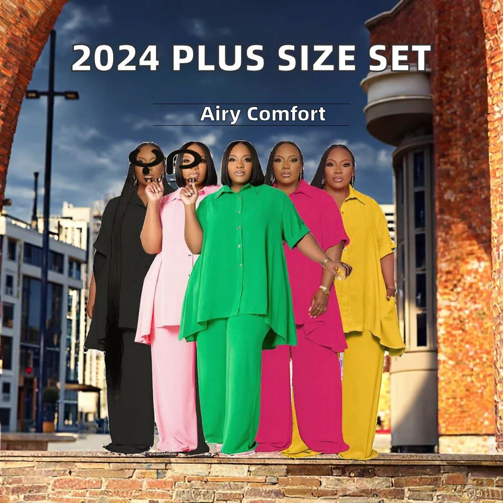 2026 Women's Clothing New Plus Size Fashionable Floral Print Solid Color Short-Sleeved Top Woven Wide Leg Pants Casual Summer