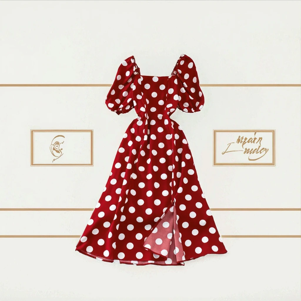 Women's Summer Casual Midi Dresses Square Neck Short Sleeve High Waist Long Split Polka Dot Pattern Breathable Woven Digital