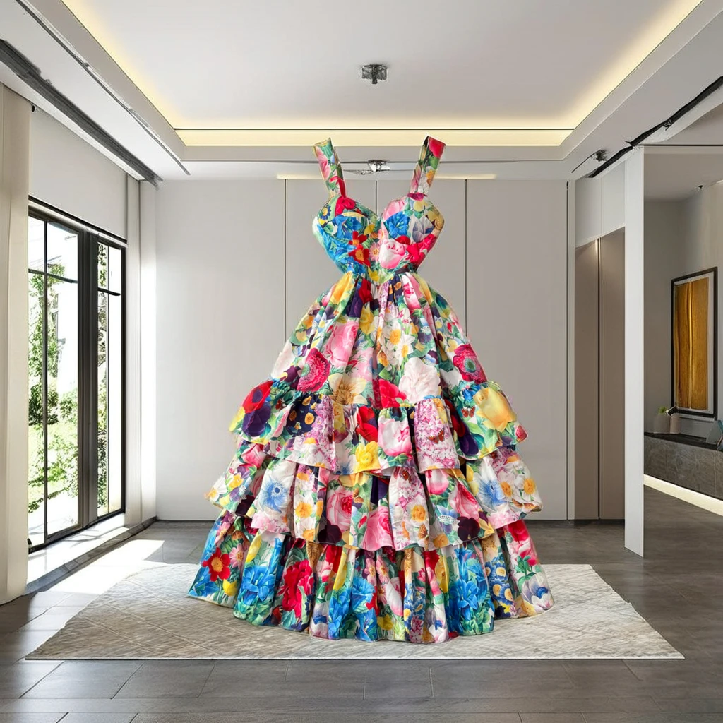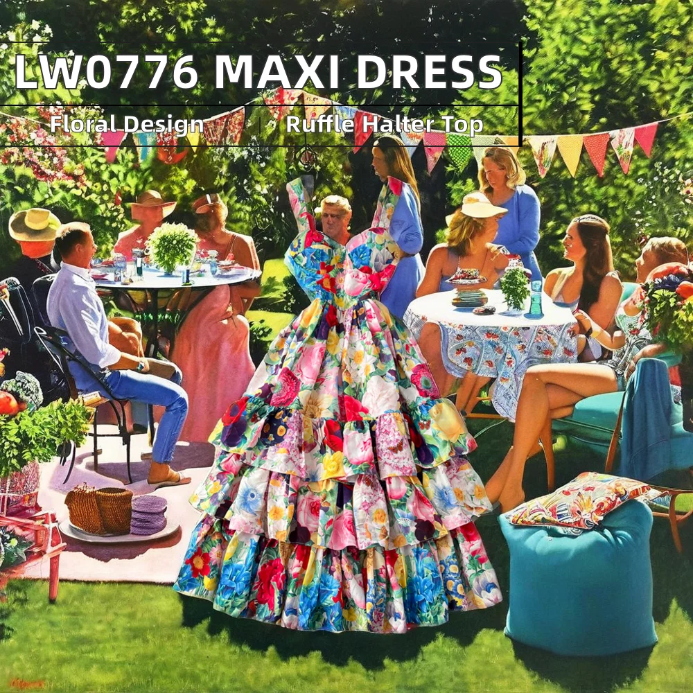 2026 Women's Slimming Halter Dress French Waist Ruffled Skirt Casual Sexy Translucent Print Holiday Wear-XL Autumn Winter
