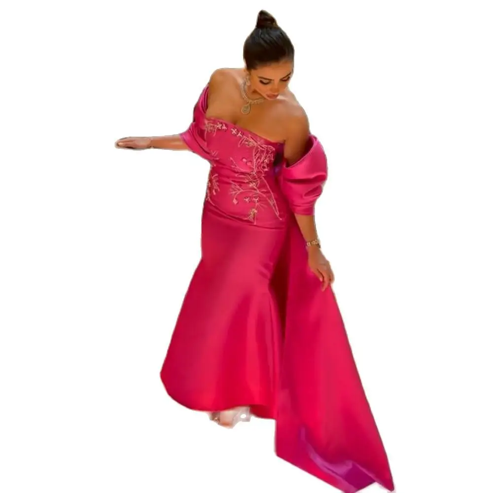 Hot Pink Mermaid Dubai Luxury Evening Dresses With Cape Shawl Arabic Women Long Wedding Party Guest Gowns